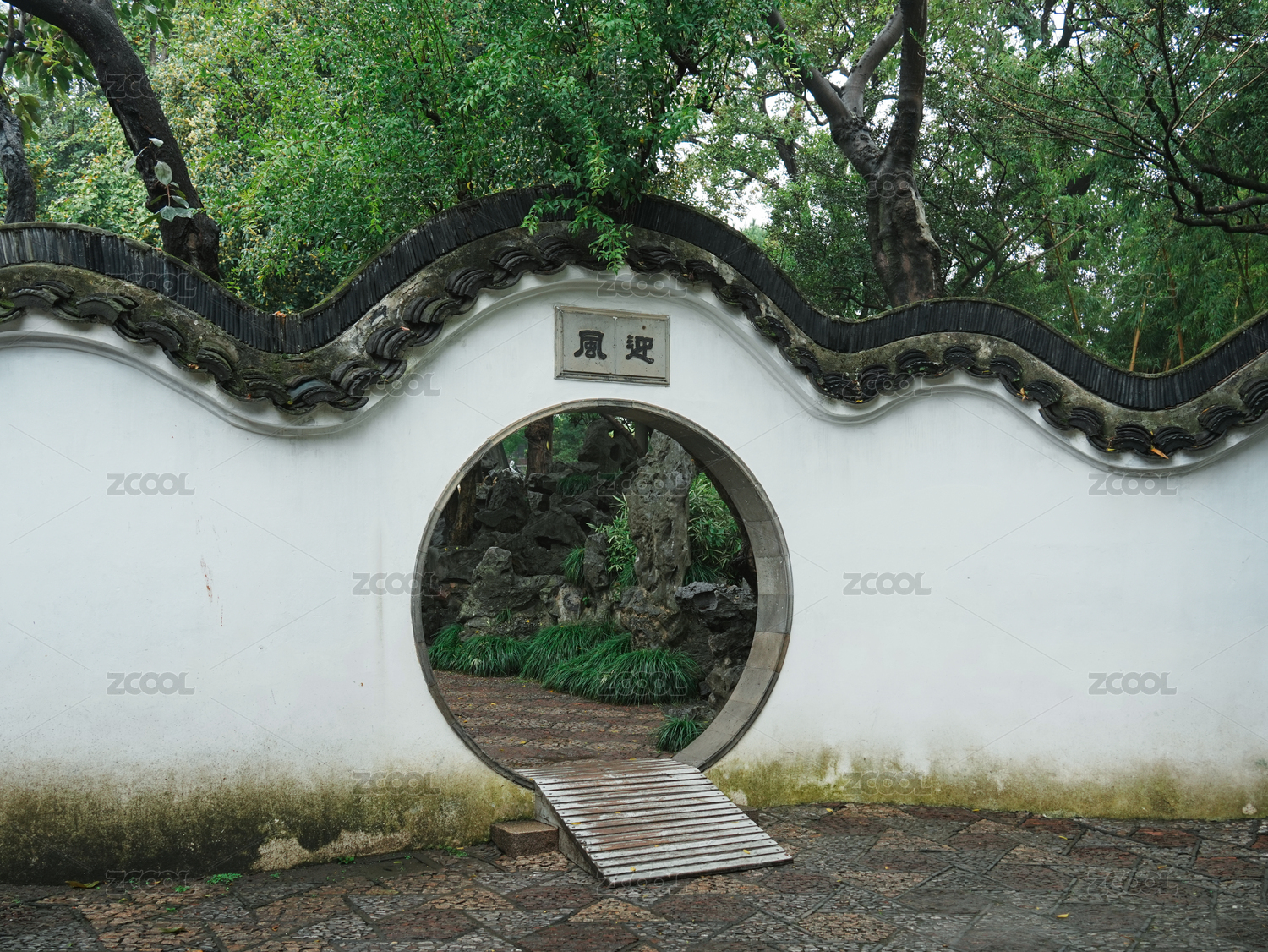 中国江南园林庭院围墙圆形门洞