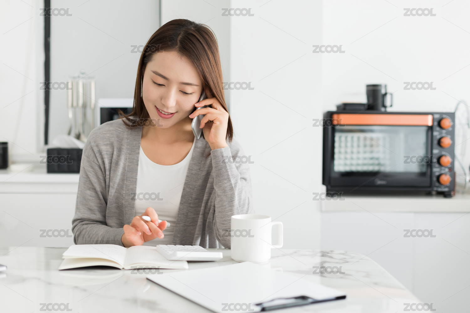 年轻女性一边接听电话一边写字工作