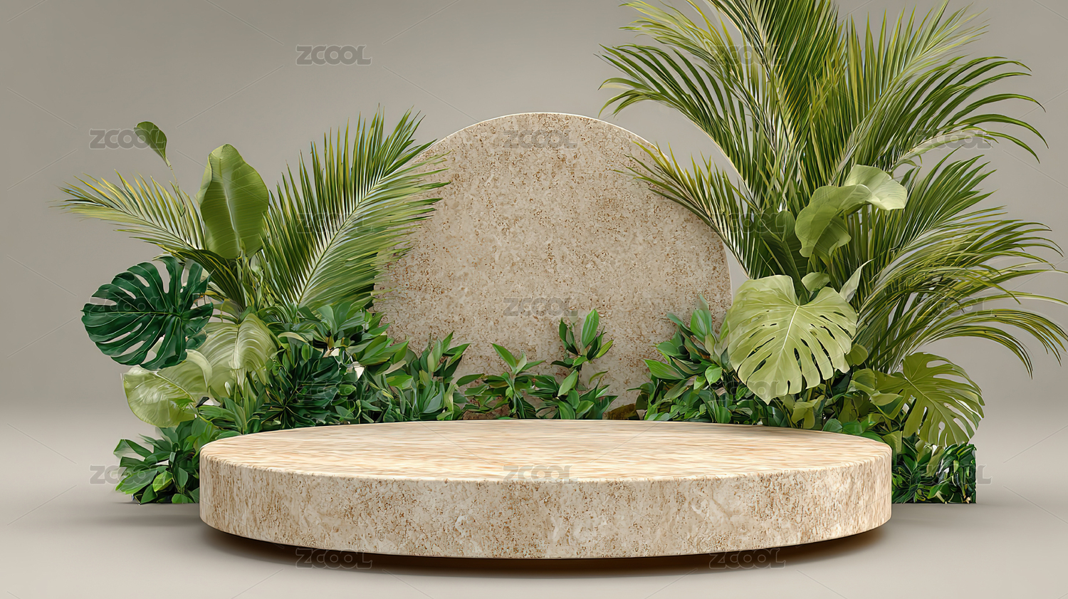 白色圆台与绿植背景