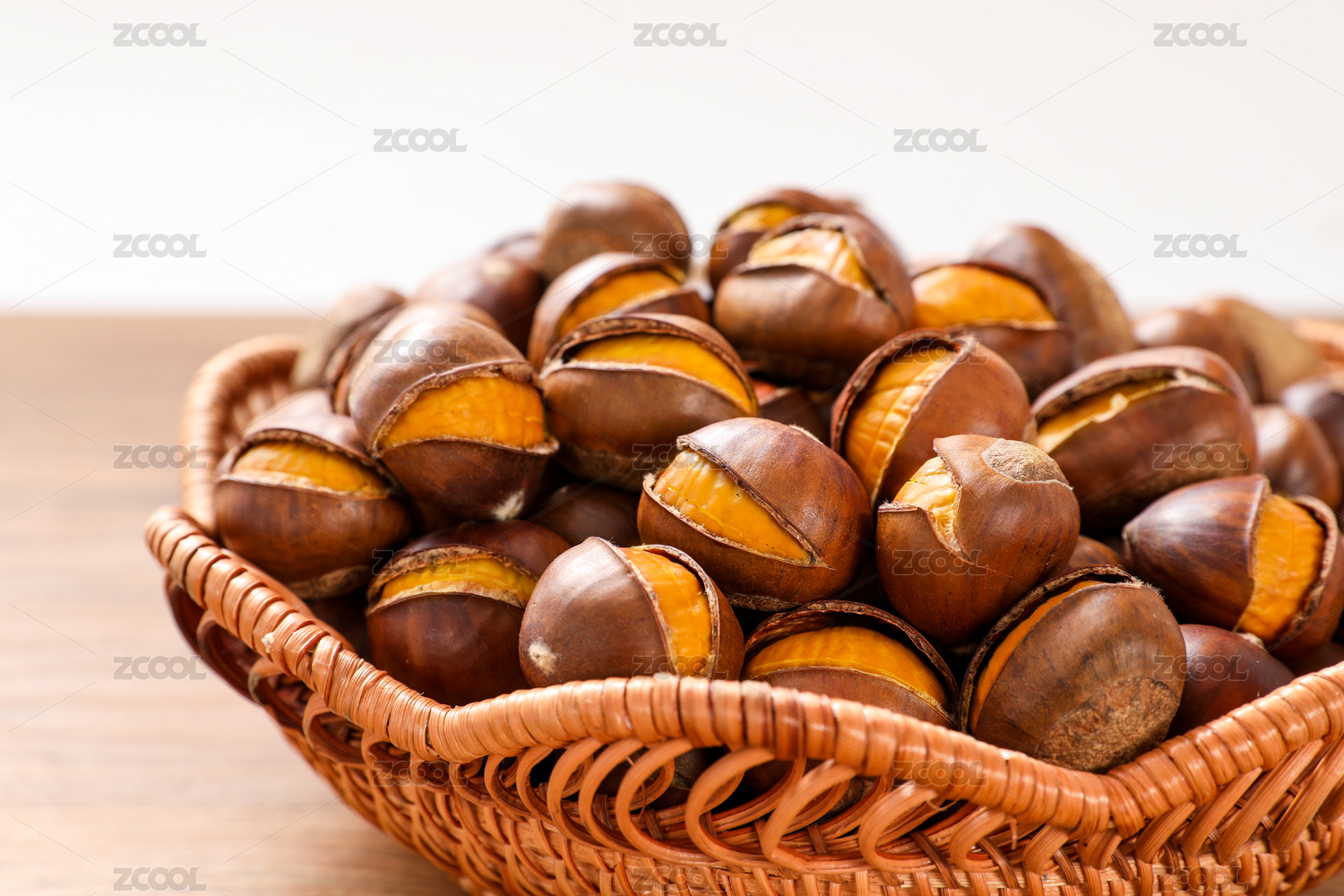 桌面上放着一篮炒熟的开口板栗