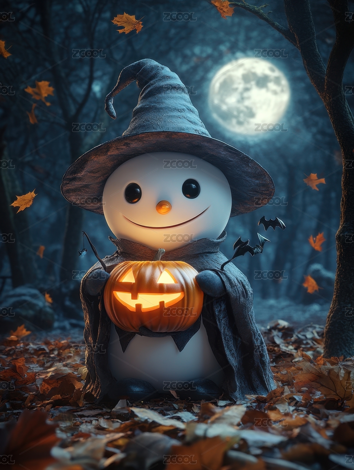 万圣节拎着南瓜灯戴着女巫帽的幽灵