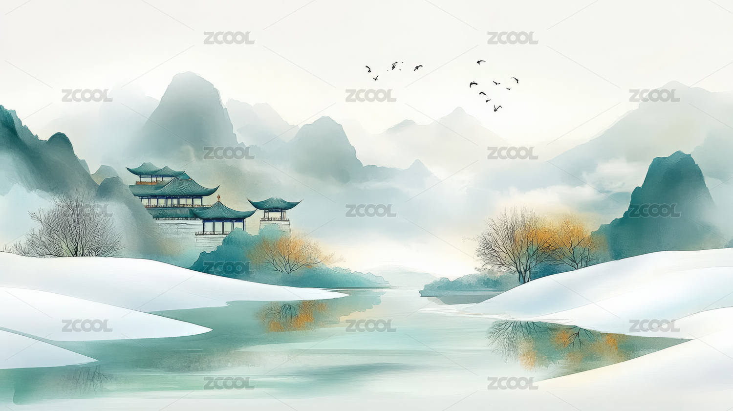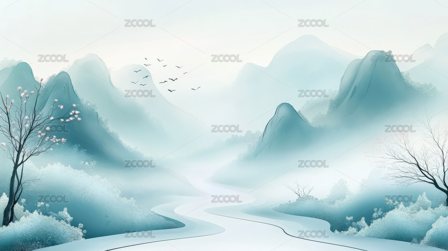 新国风古风国潮青绿山水画水墨传统背景壁纸