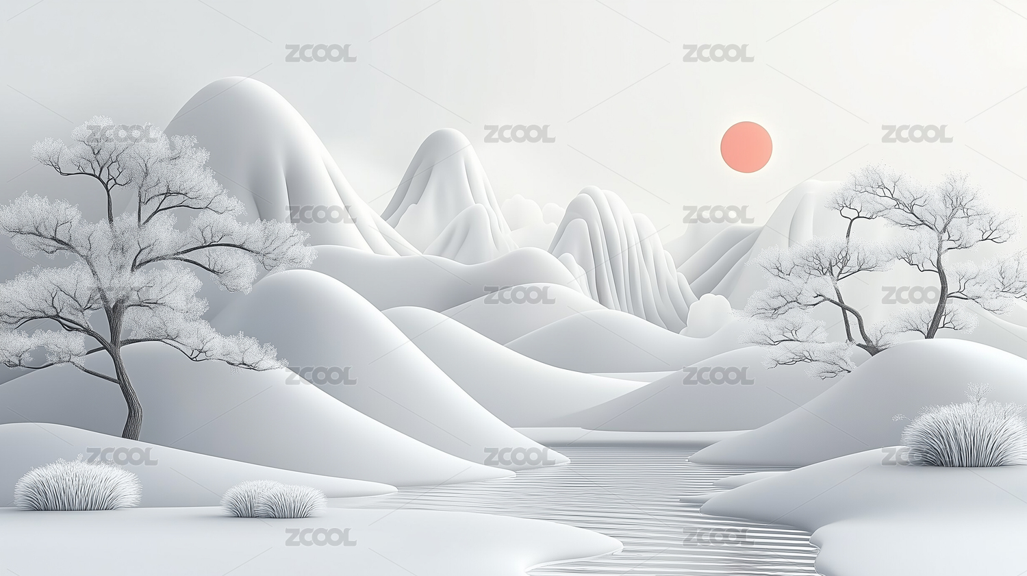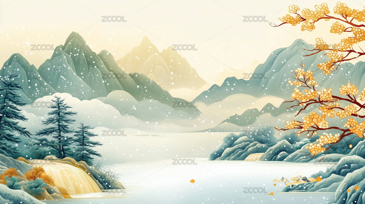山河,水墨画,风景,冬季,雪景,房屋,小船,树木,桃花,宁静