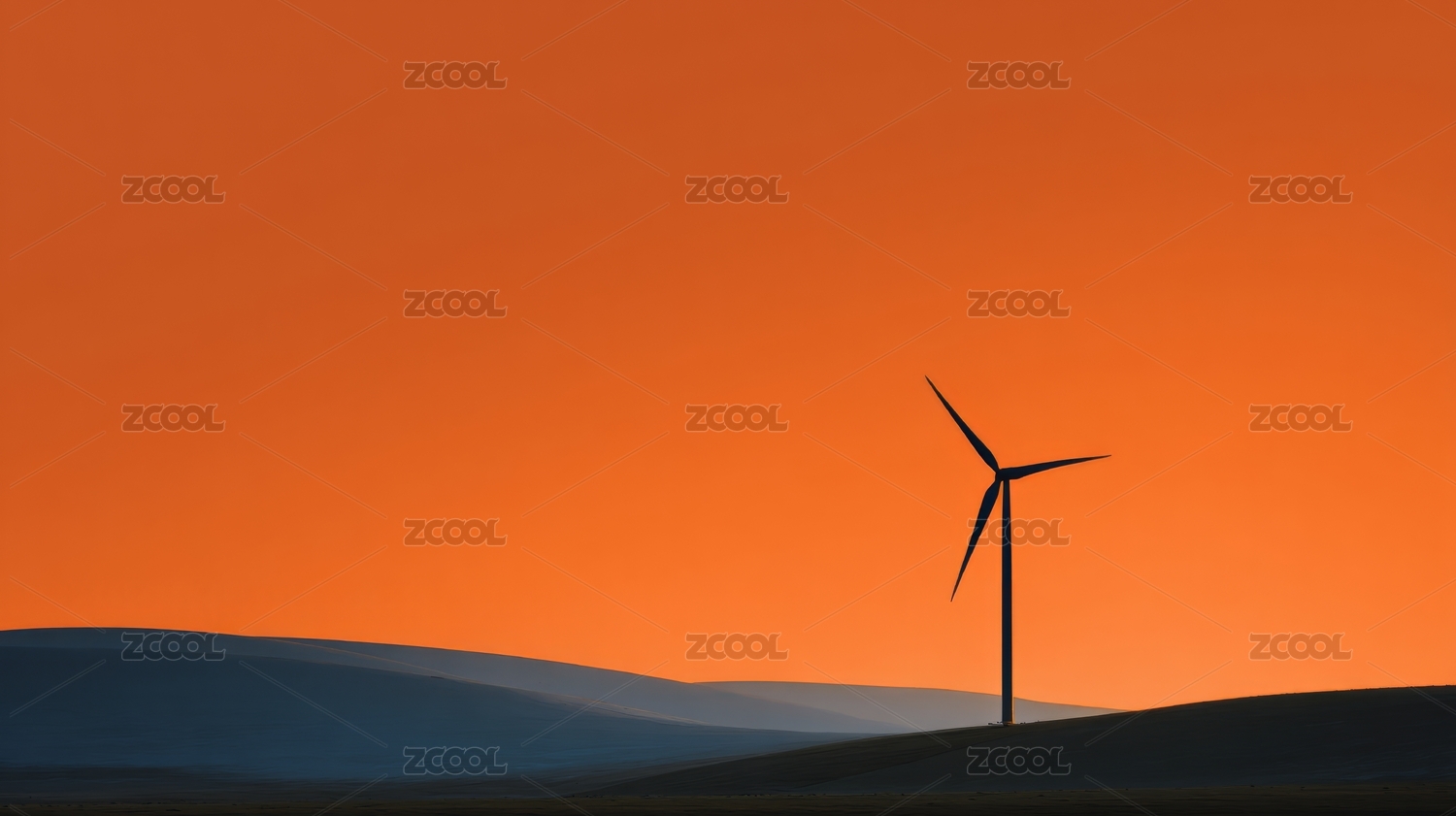 夕阳下的天空映衬着风力涡轮机