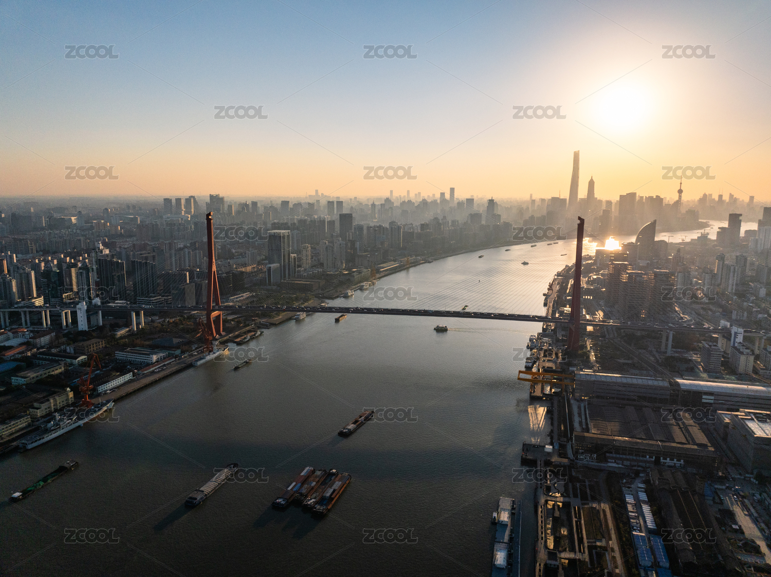 俯瞰中国上海徐浦大桥和黄浦江两岸城市景观