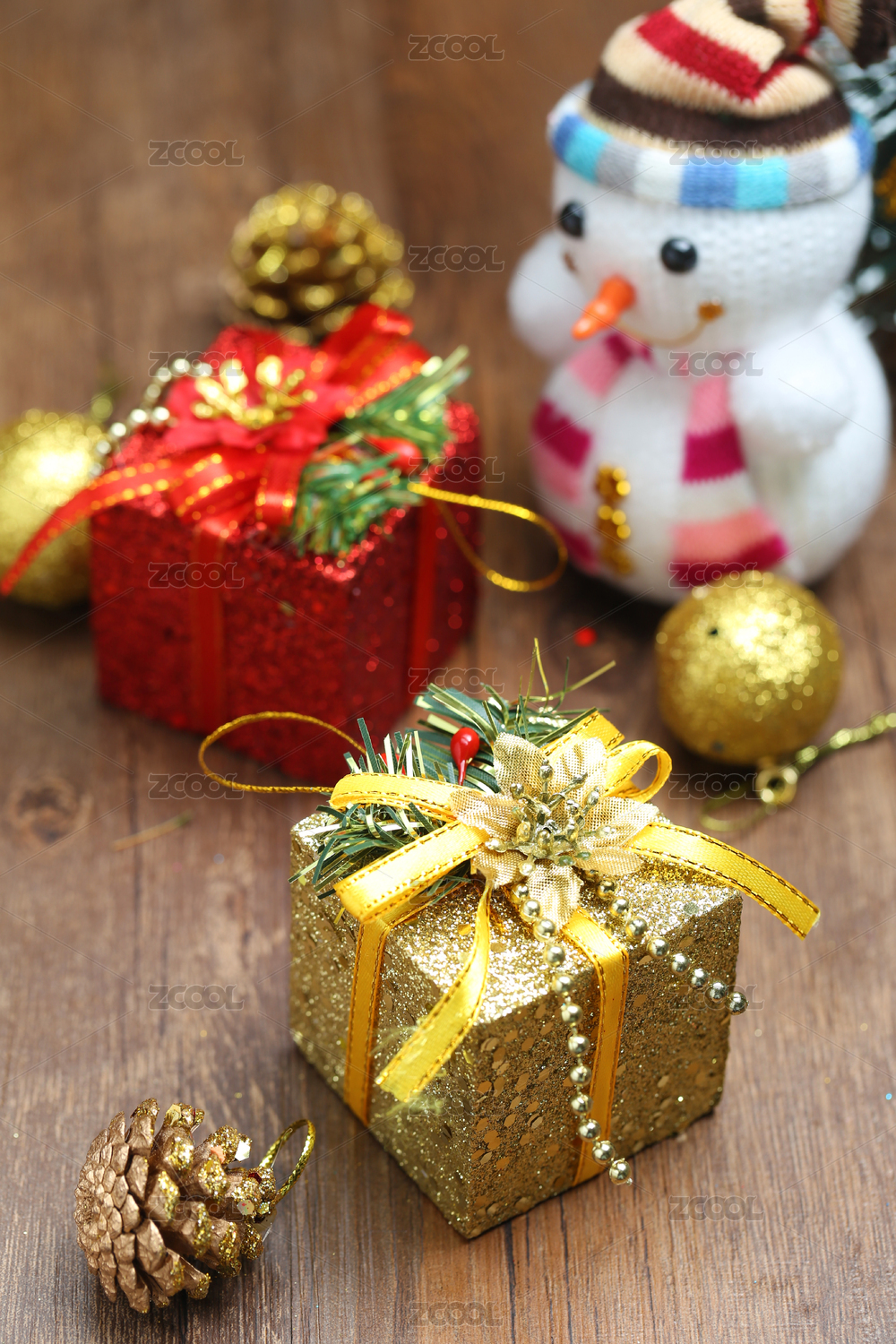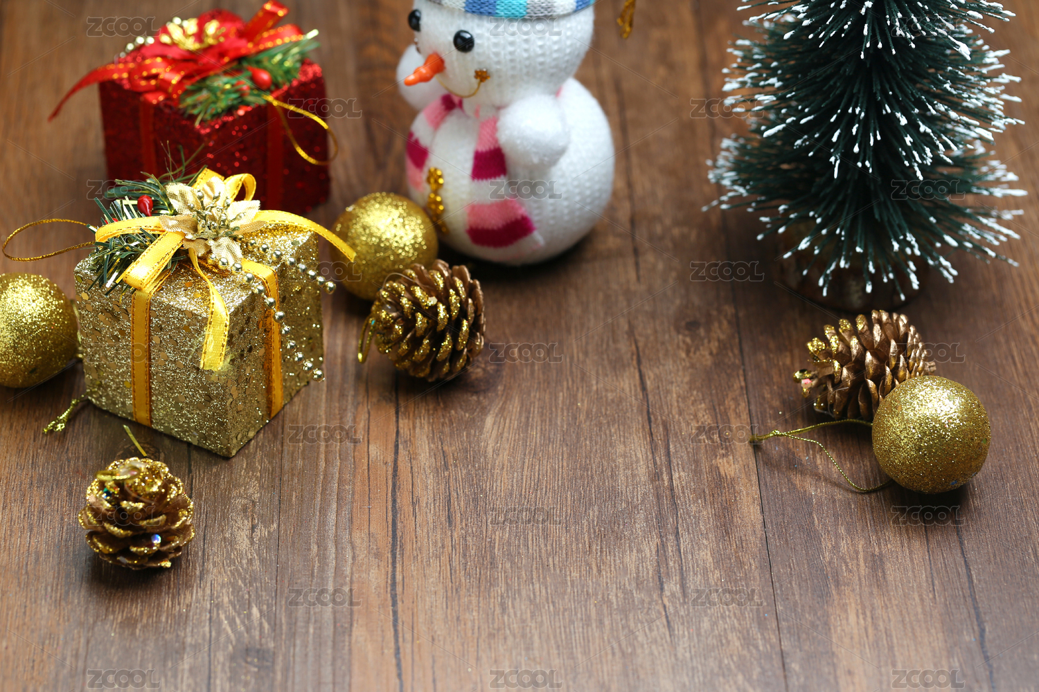 木桌面一角堆着礼盒和金色圣诞装饰物