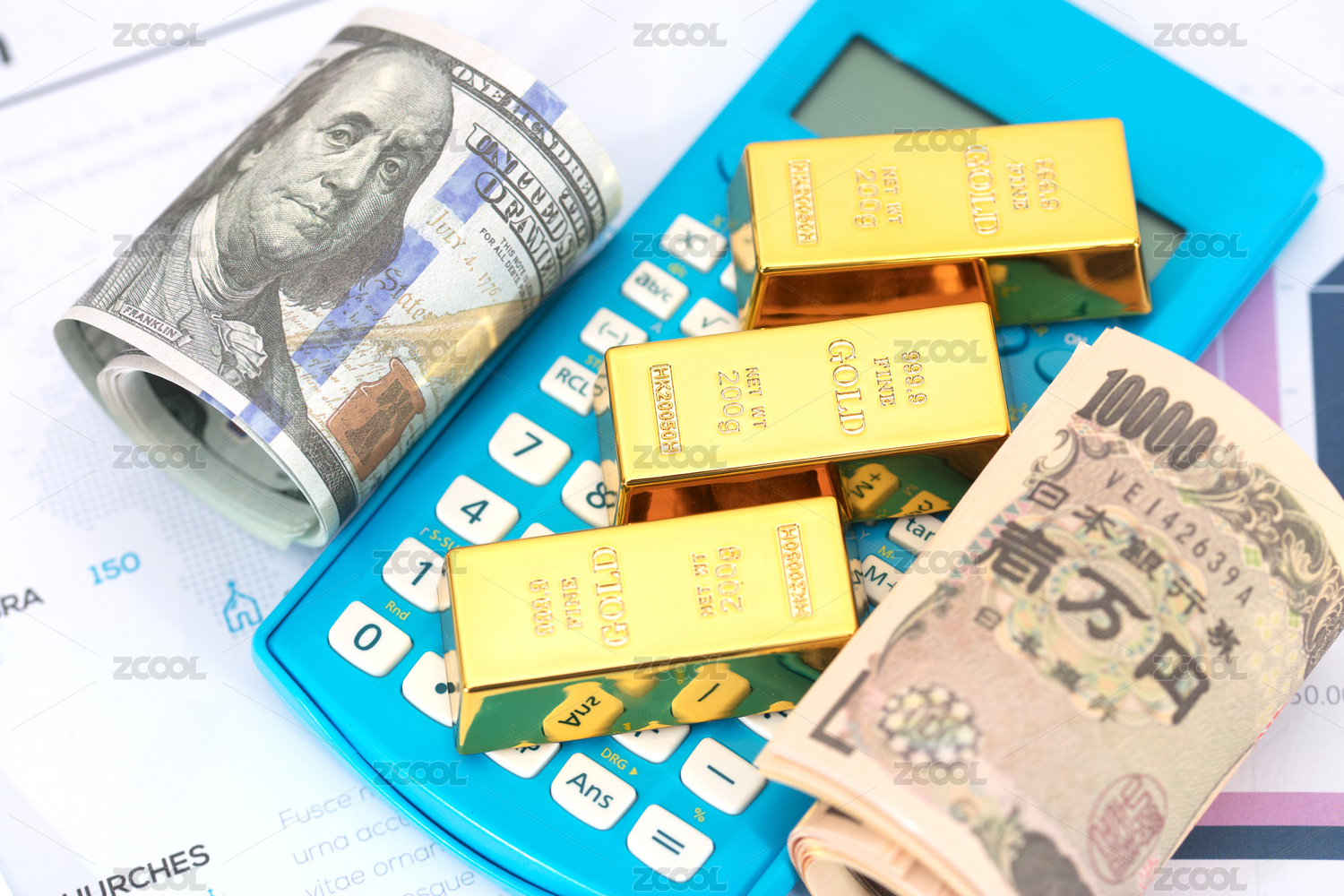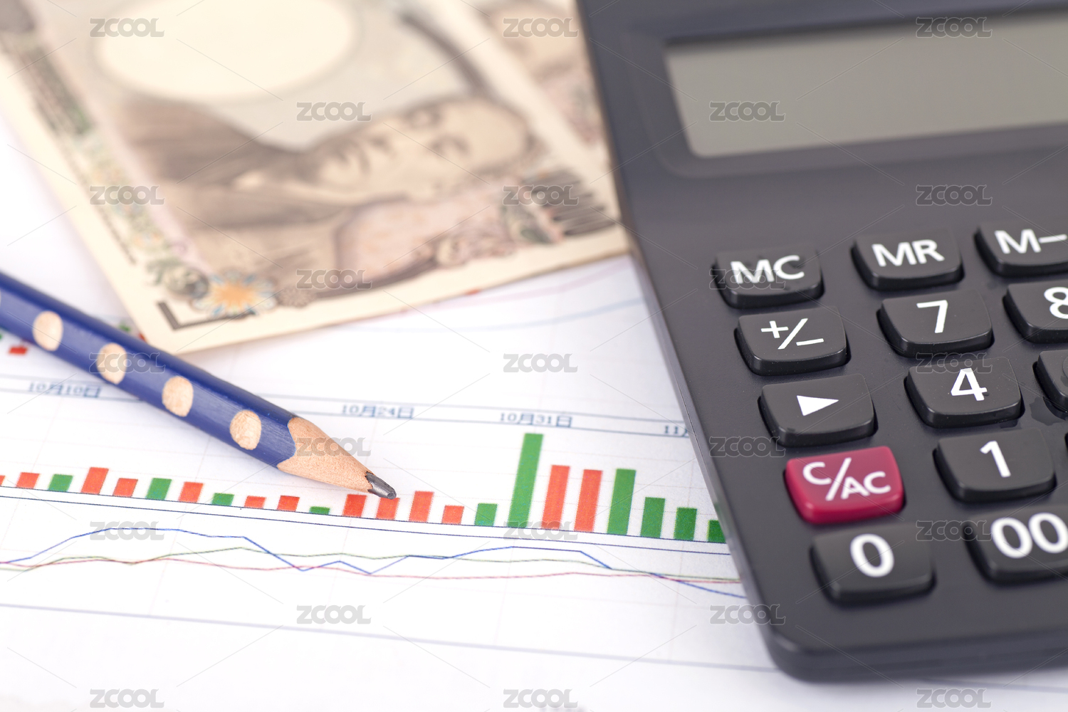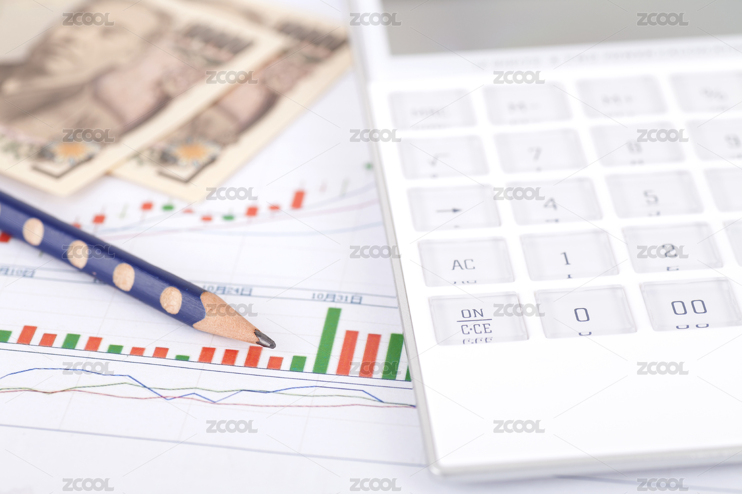 计算器、美金、美元钞票、笔、商业图表