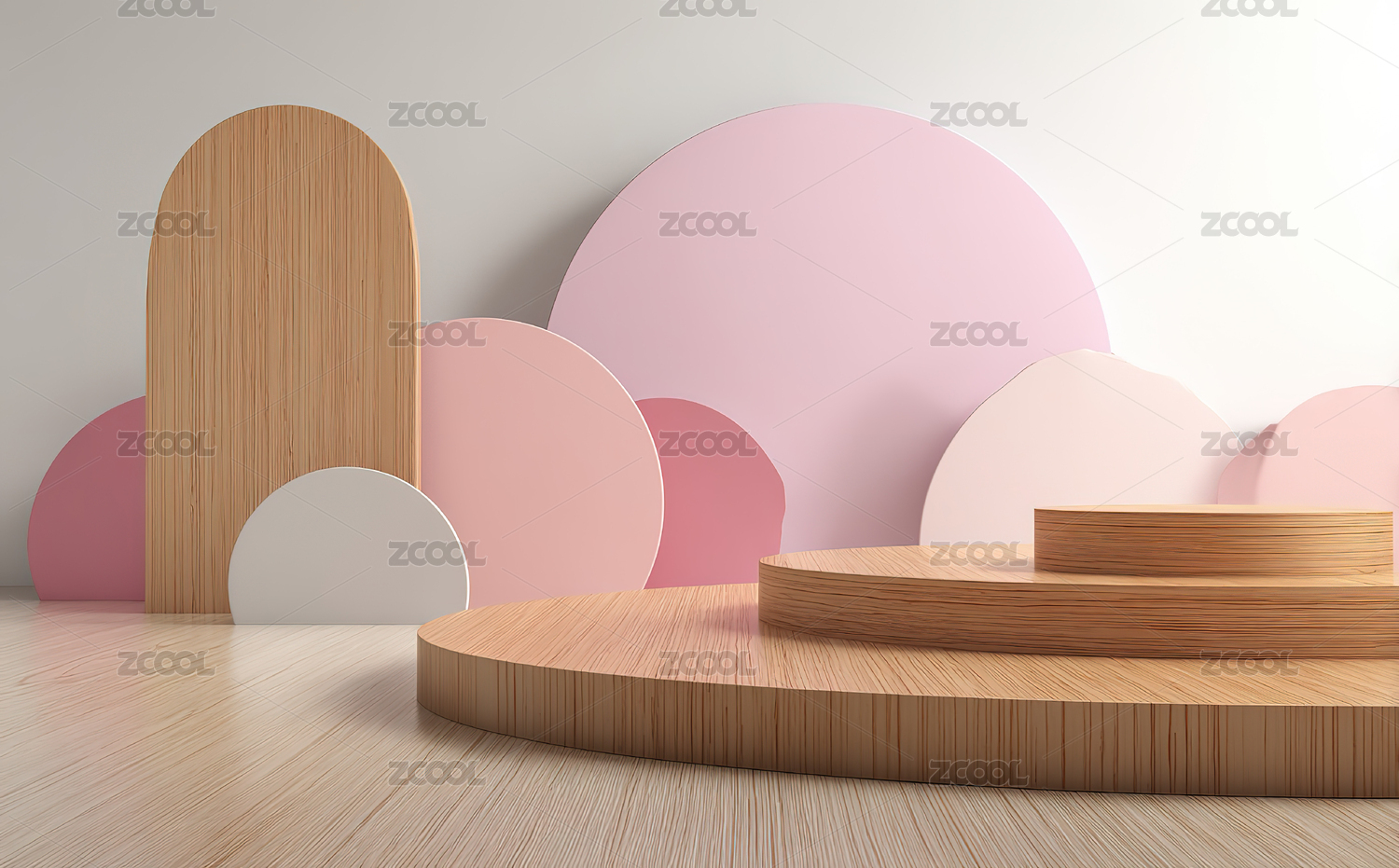 圆形,木质,展示台,粉色,绿色,简约,设计,背景,层次感