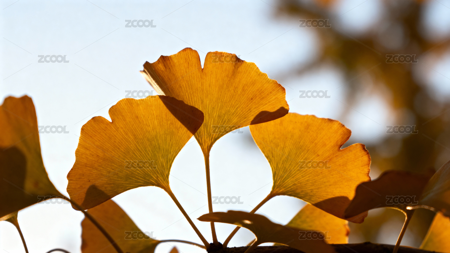 侧逆光条件下一枝金黄色的银杏叶片特写图