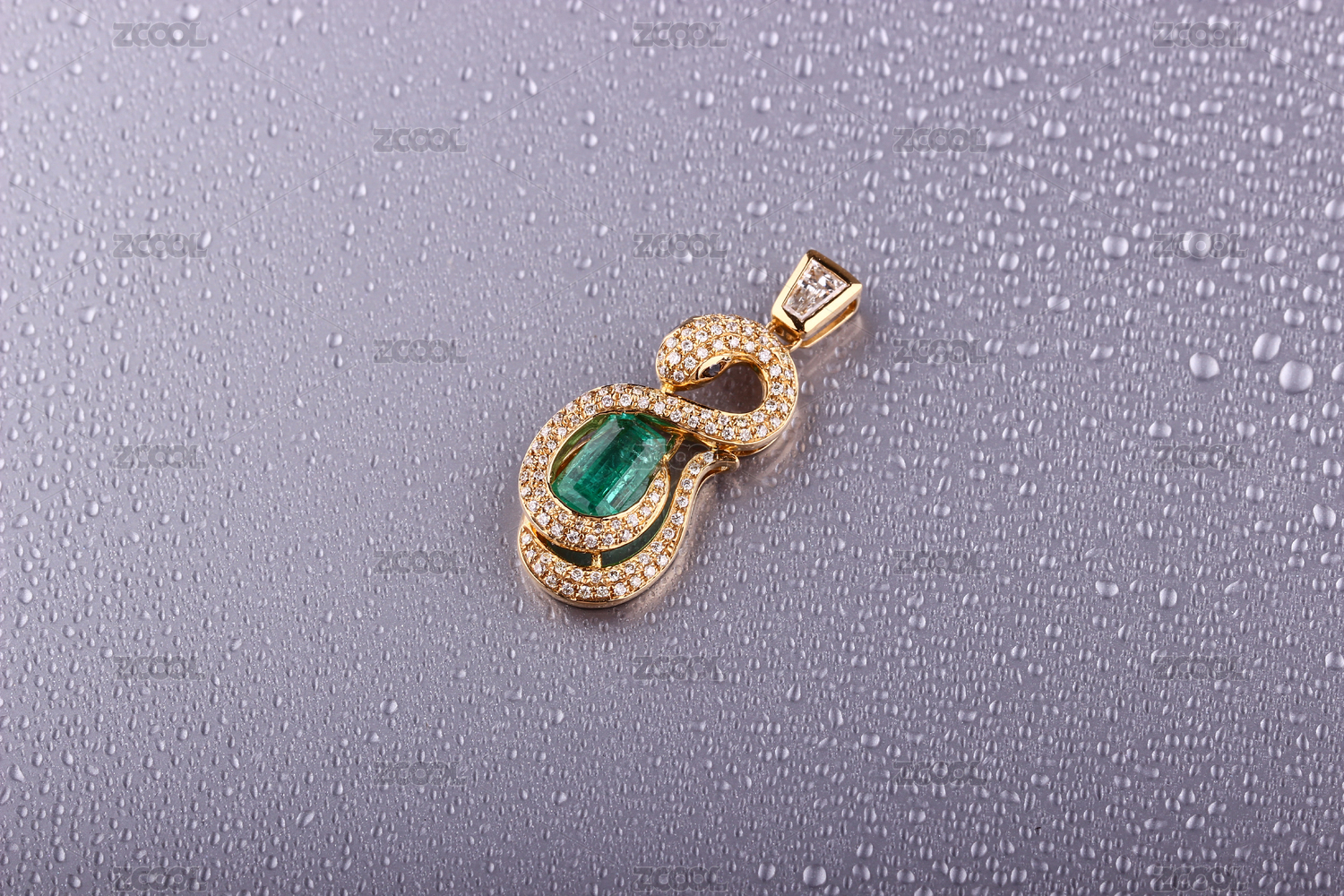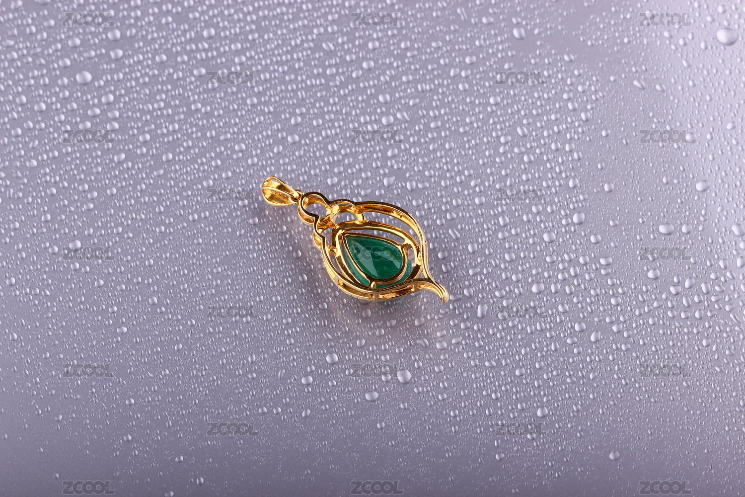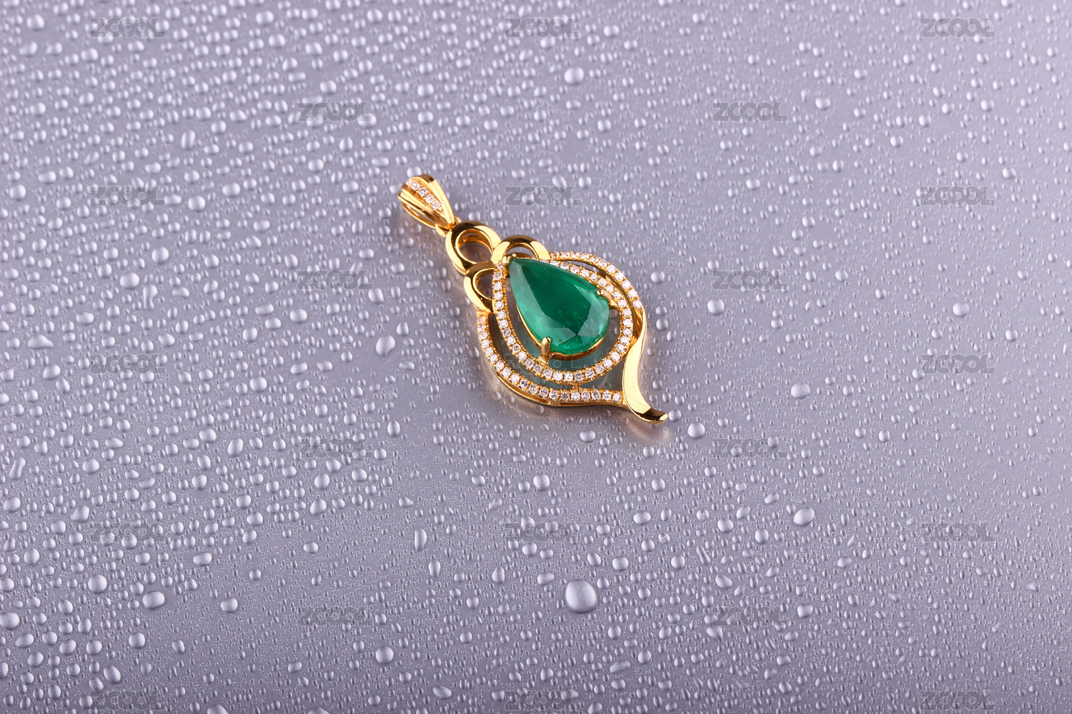 祖母绿宝石吊坠18K金晶亮的项链放在灰色的带有水珠的背景里