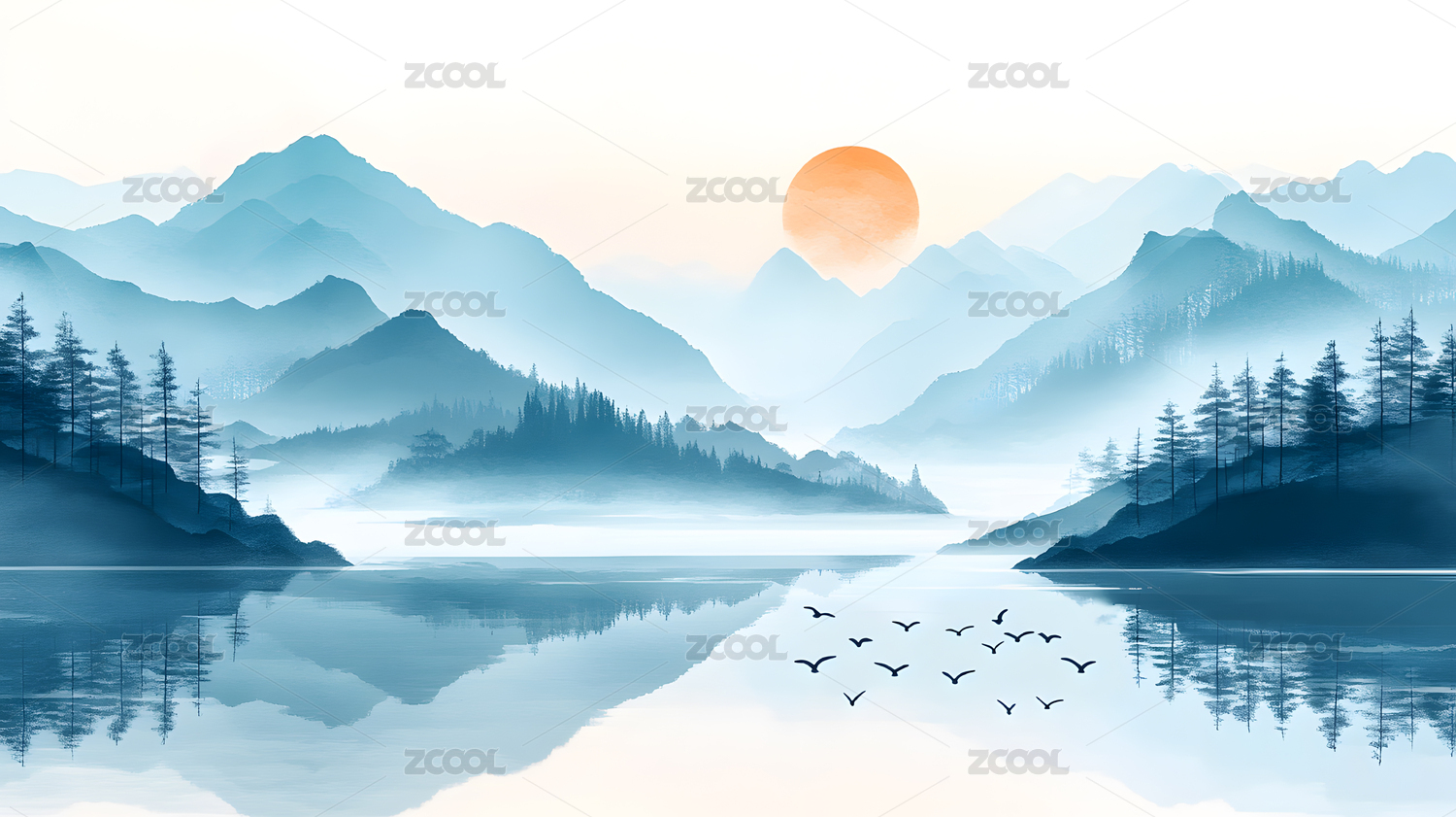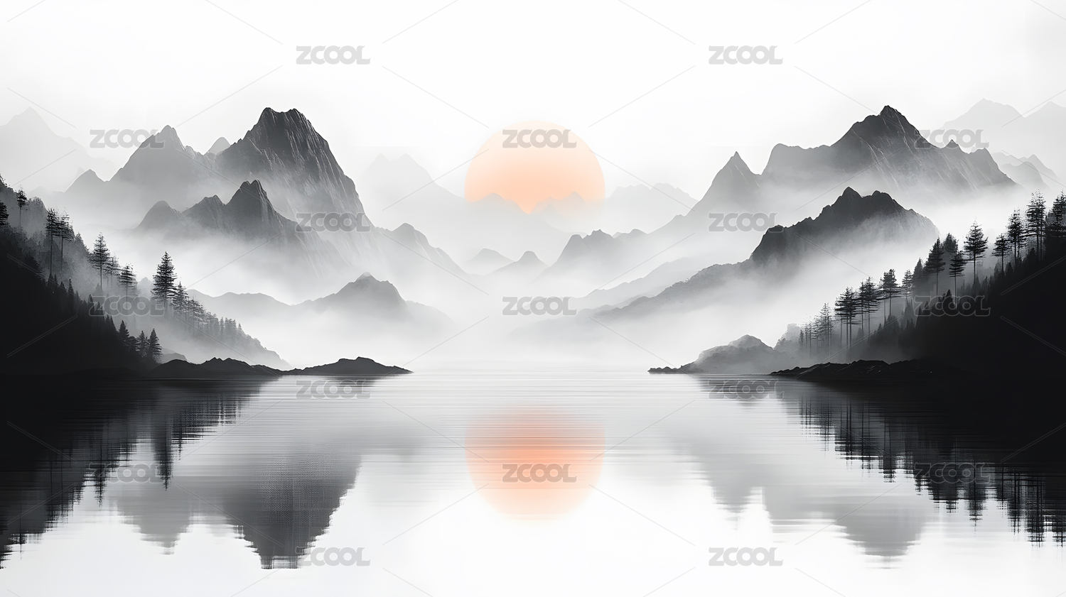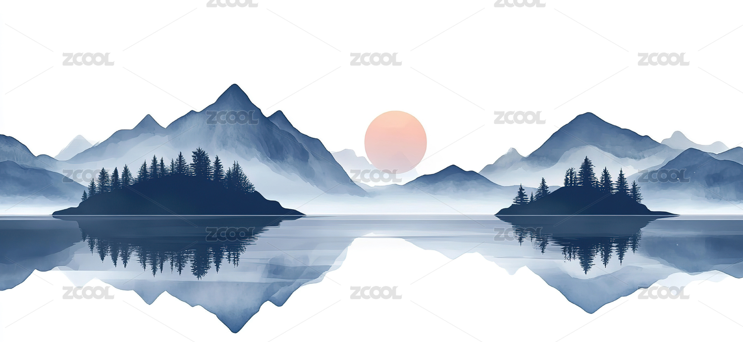水墨写意山水湖泊风景