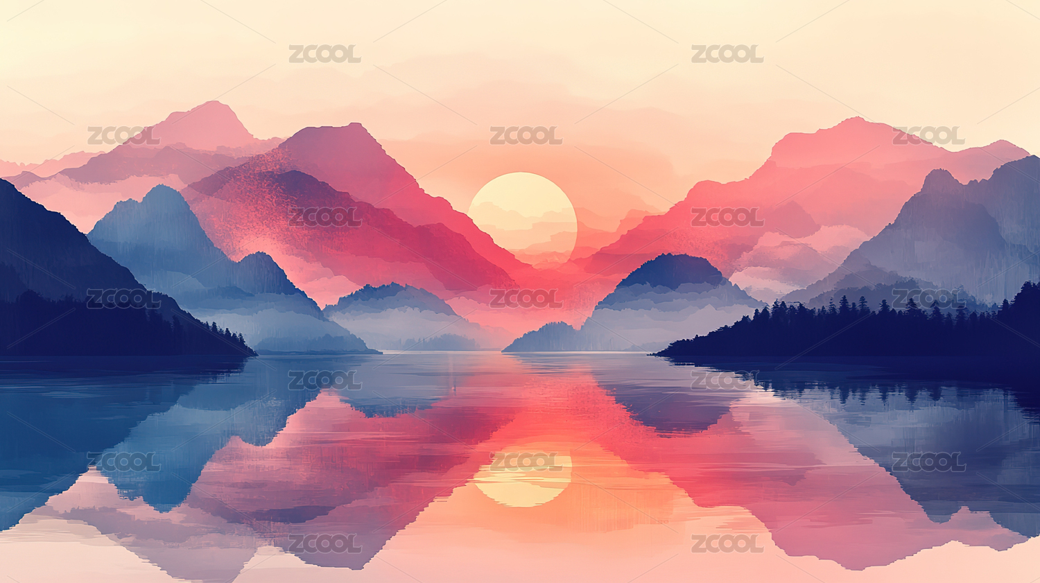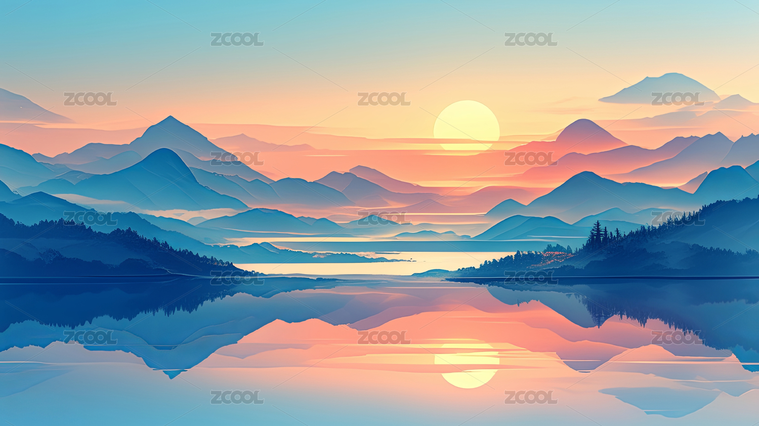 山峦日落湖面倒影