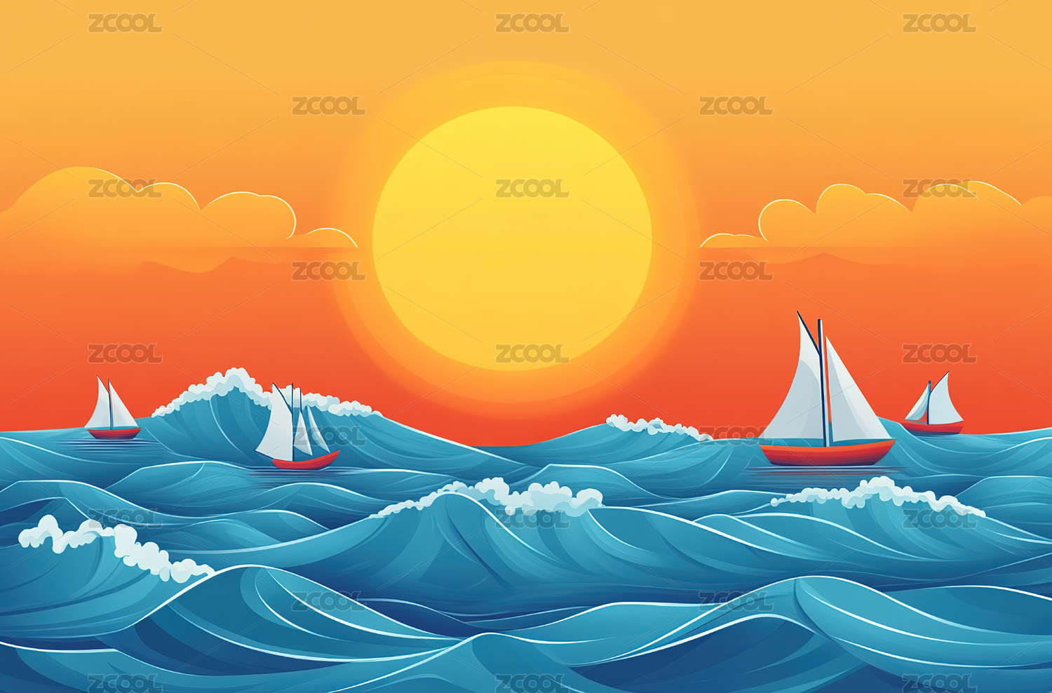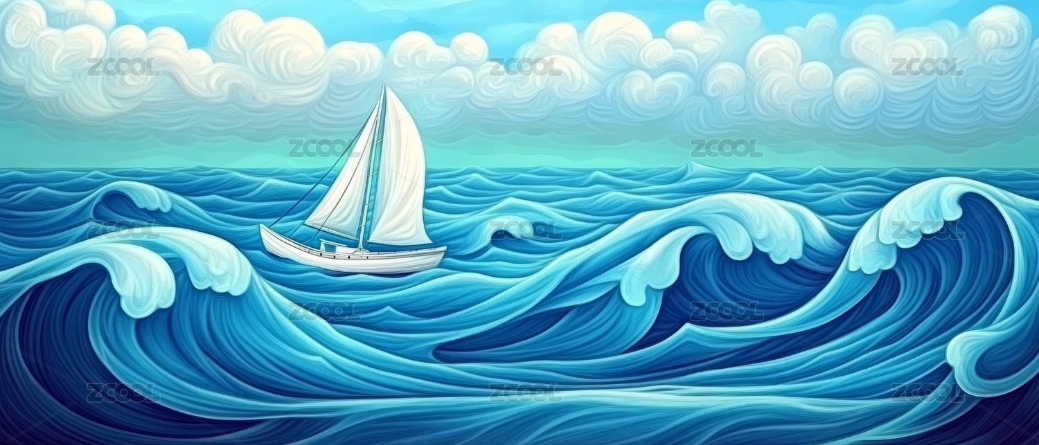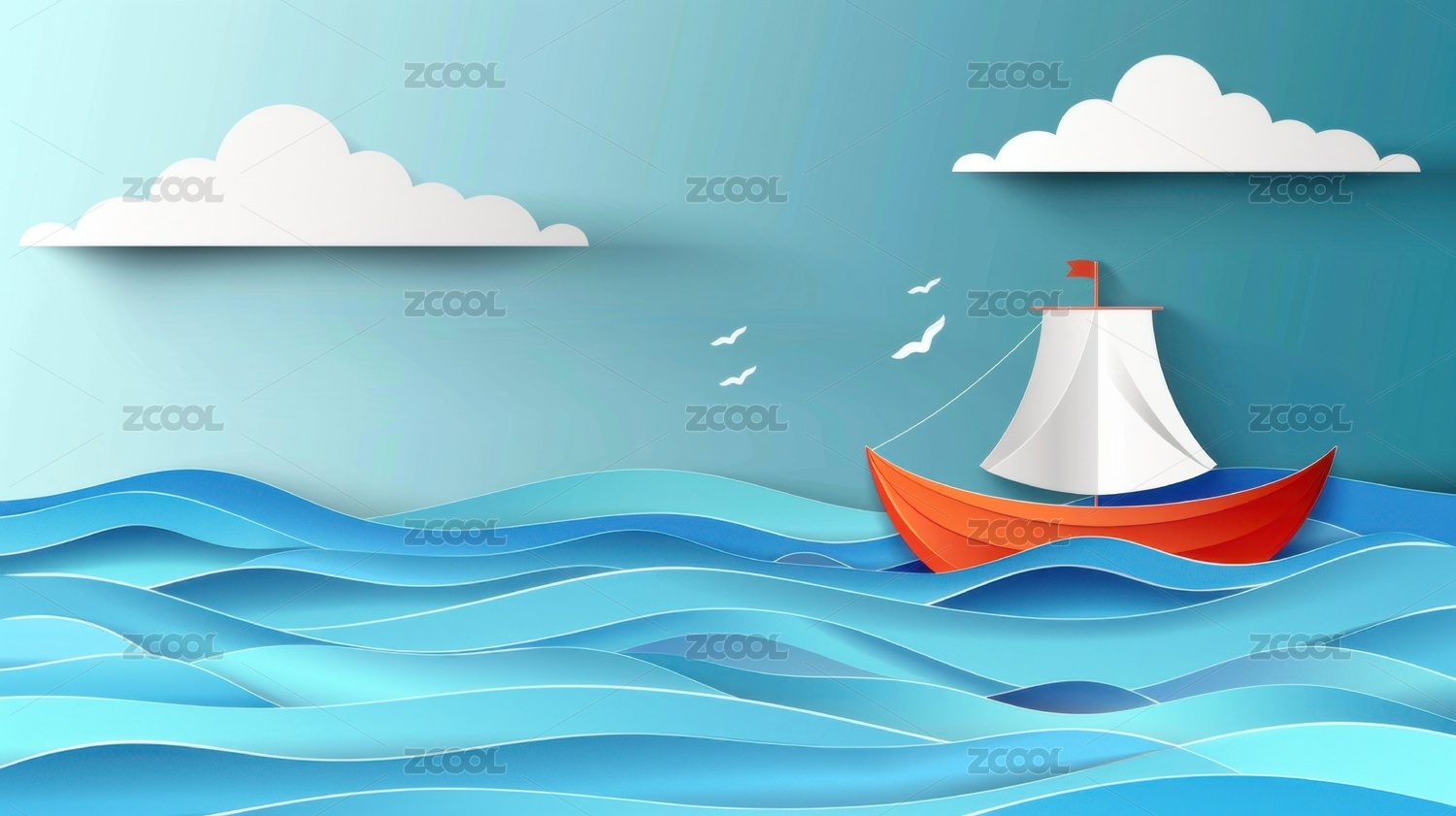 剪纸风插图波涛汹涌的海面上行驶的帆船