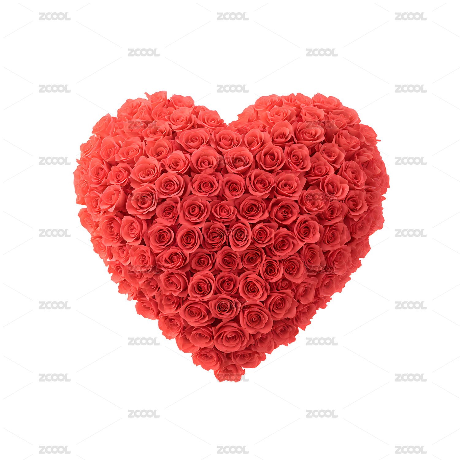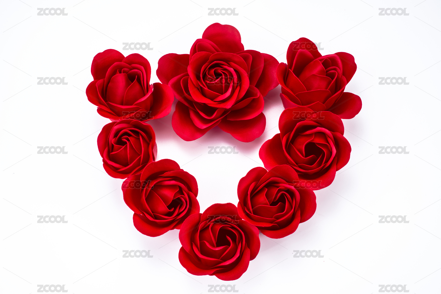 白色背景特写多朵色永生玫瑰拼成的爱心形状