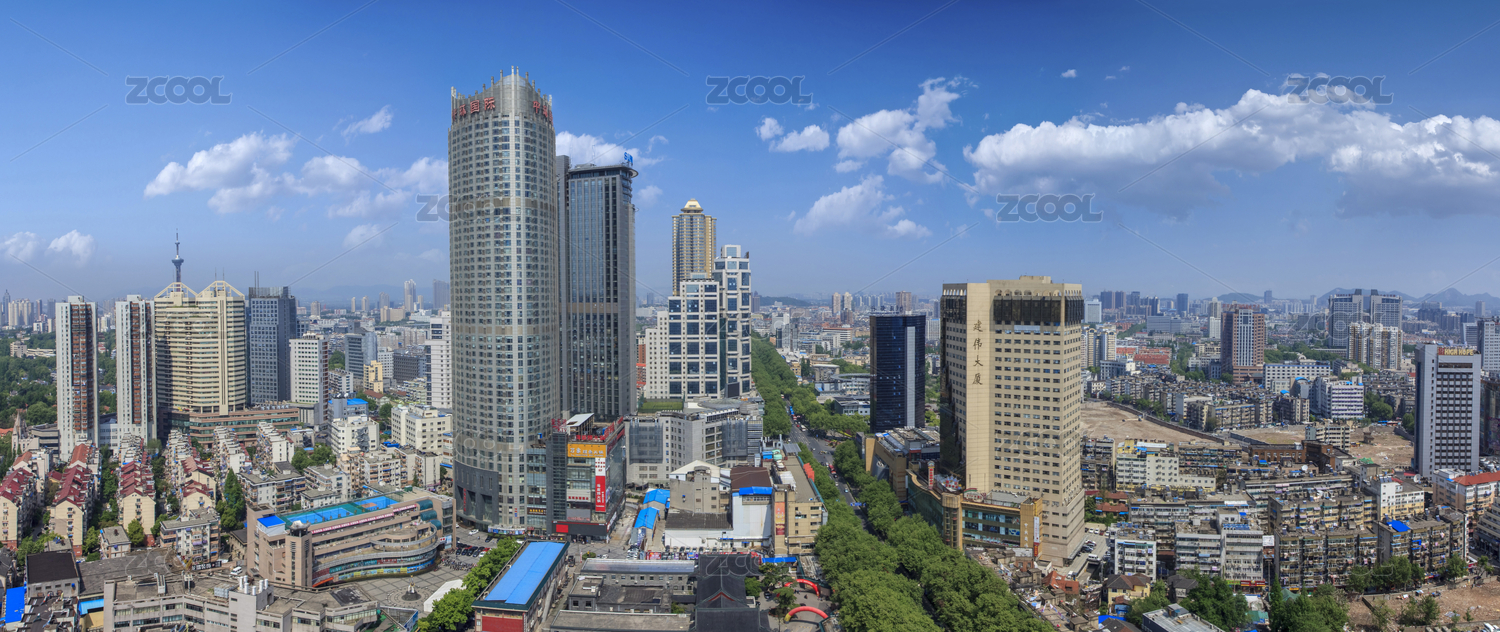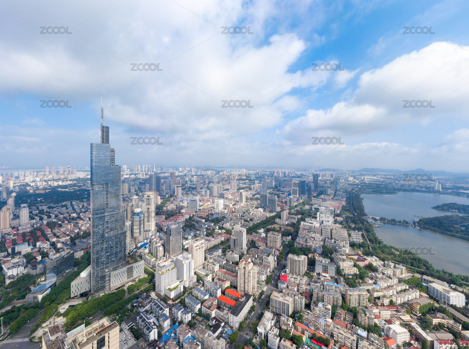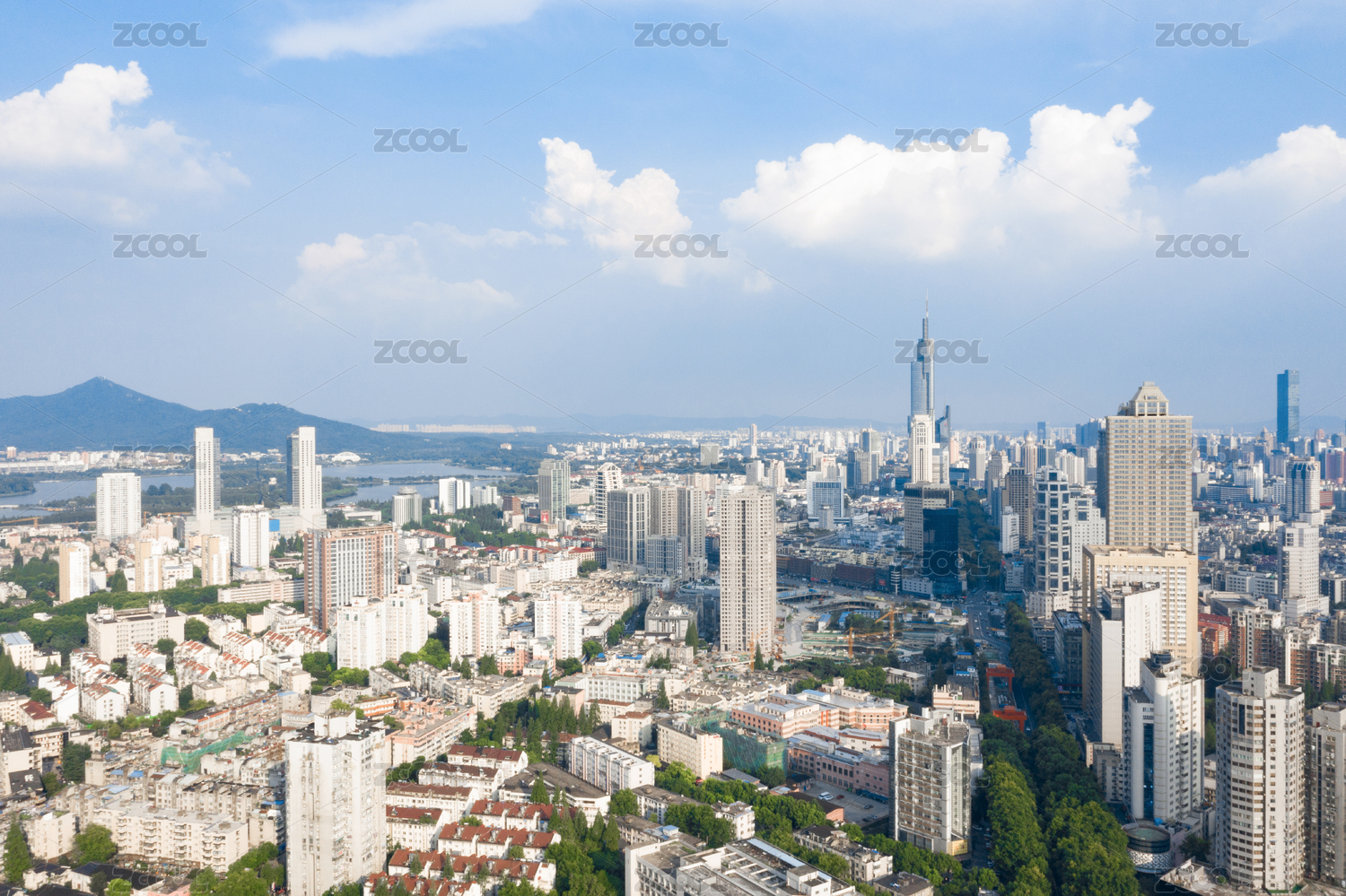 晴朗的蓝天下南京城市中心的城市天际线全景