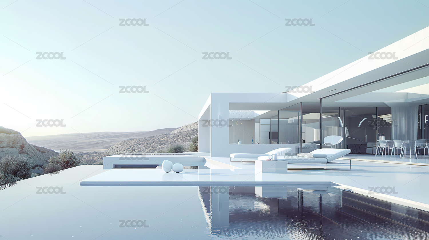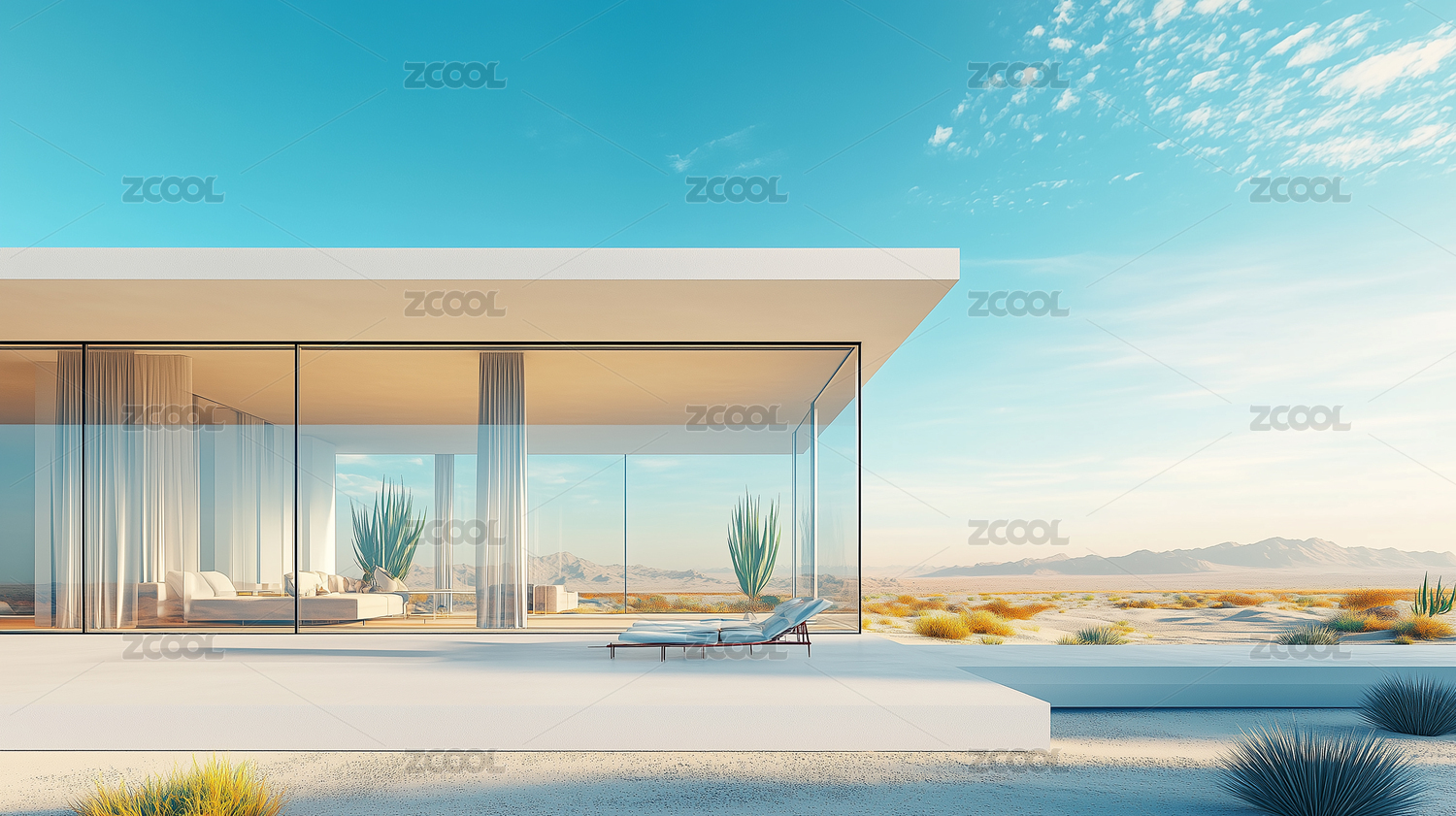 沙漠中的白色流线型艺术豪宅汽车广告背景