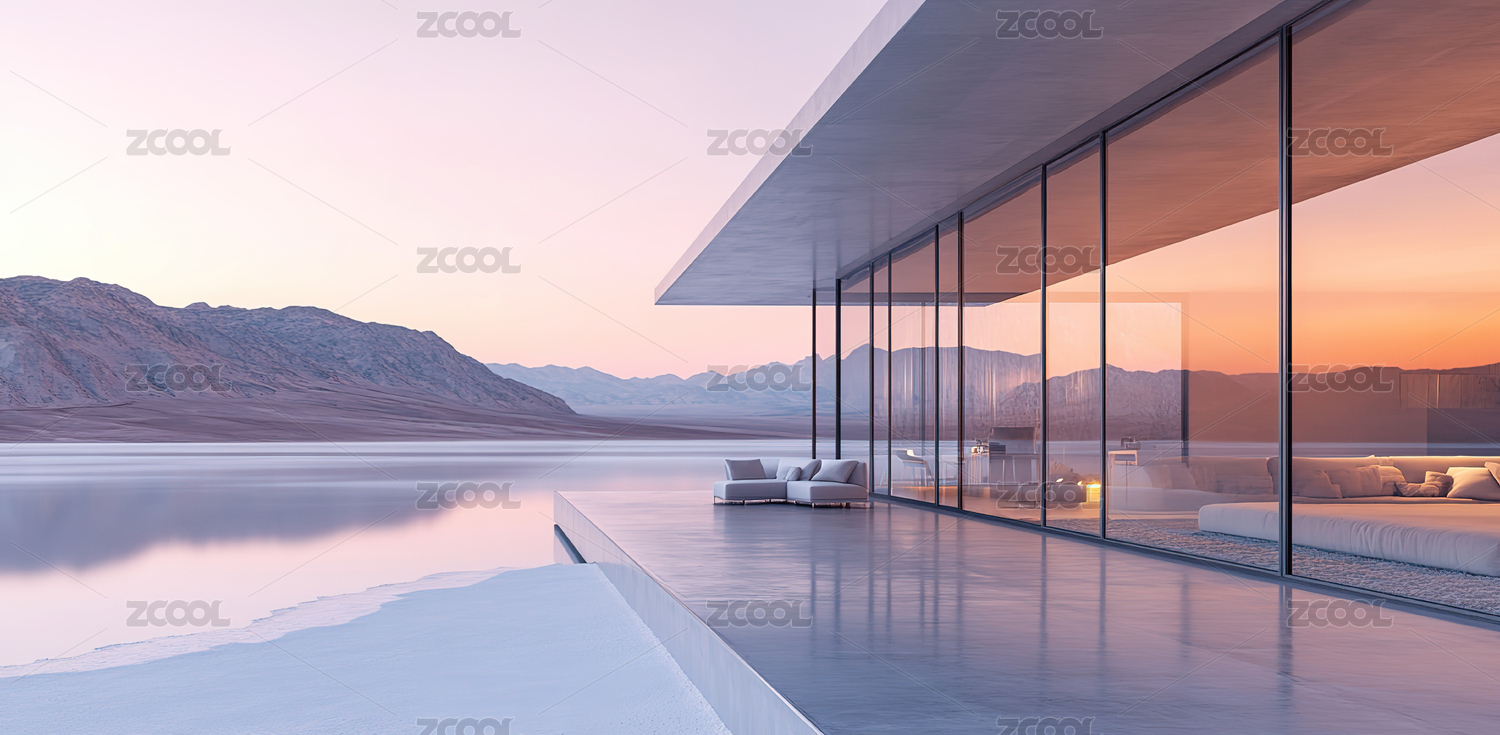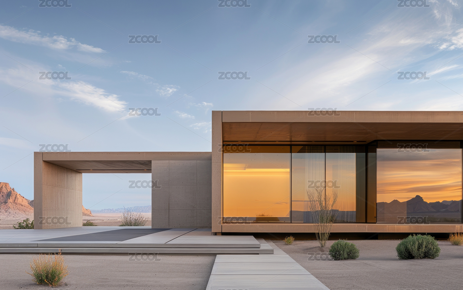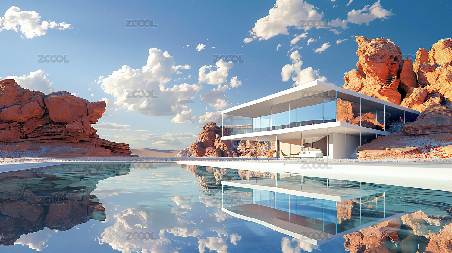 现代,建筑,沙漠,景观,反射,水池,玻璃,房屋,山脉,天空