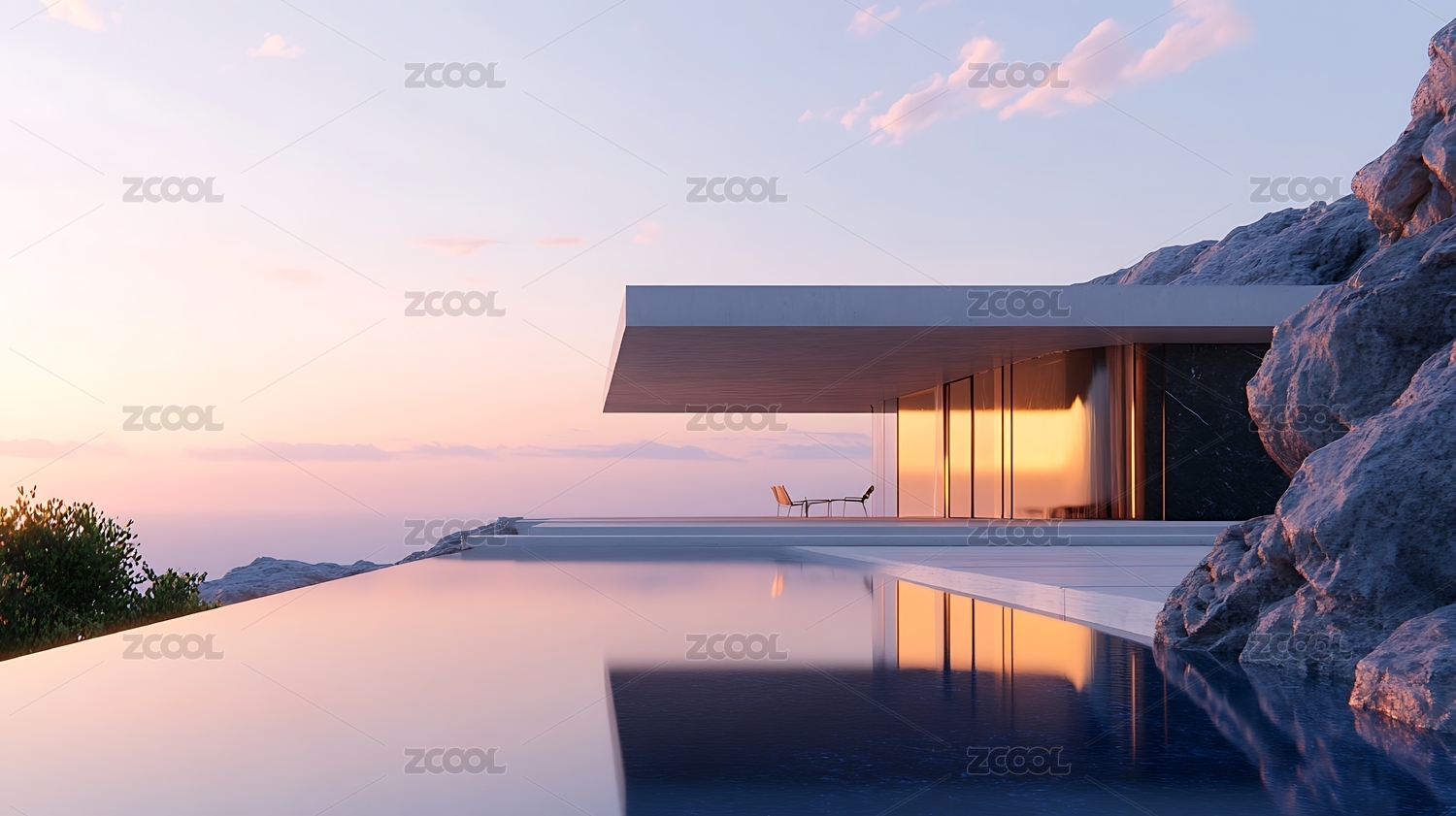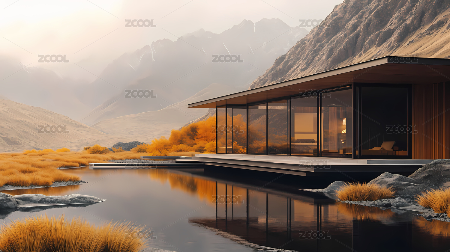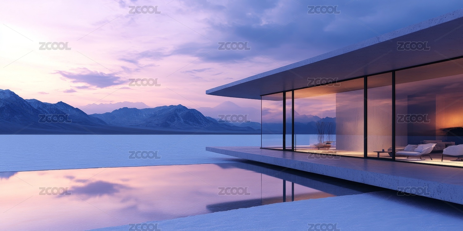 现代,建筑,沙漠,景观,反射,水池,玻璃,房屋,山脉,天空