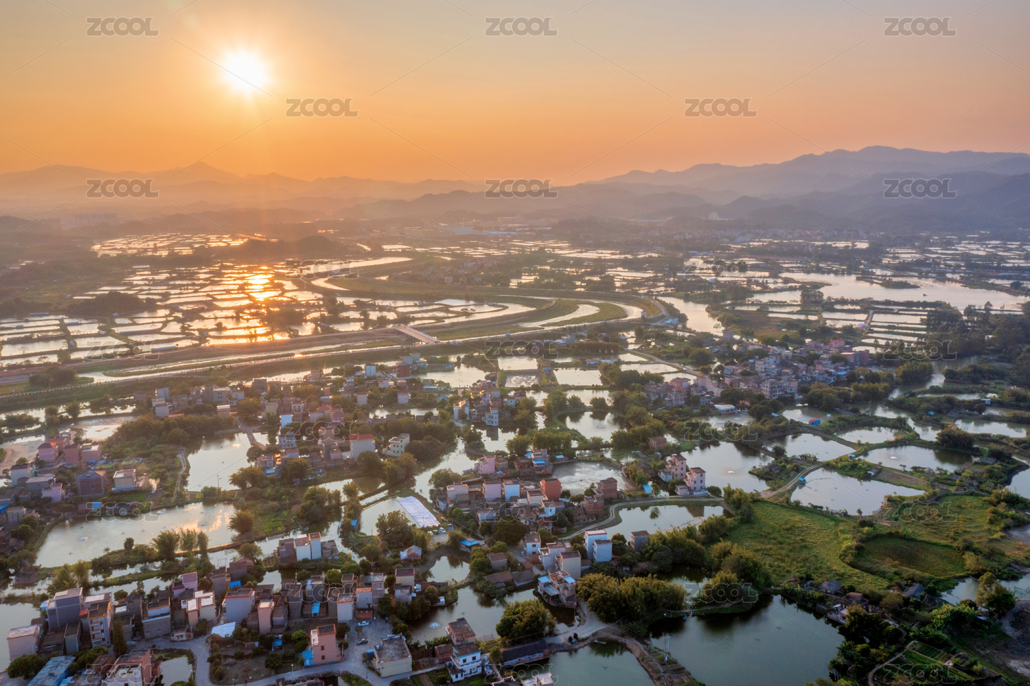 中国广东江门鹤山古劳水乡日落航拍风光