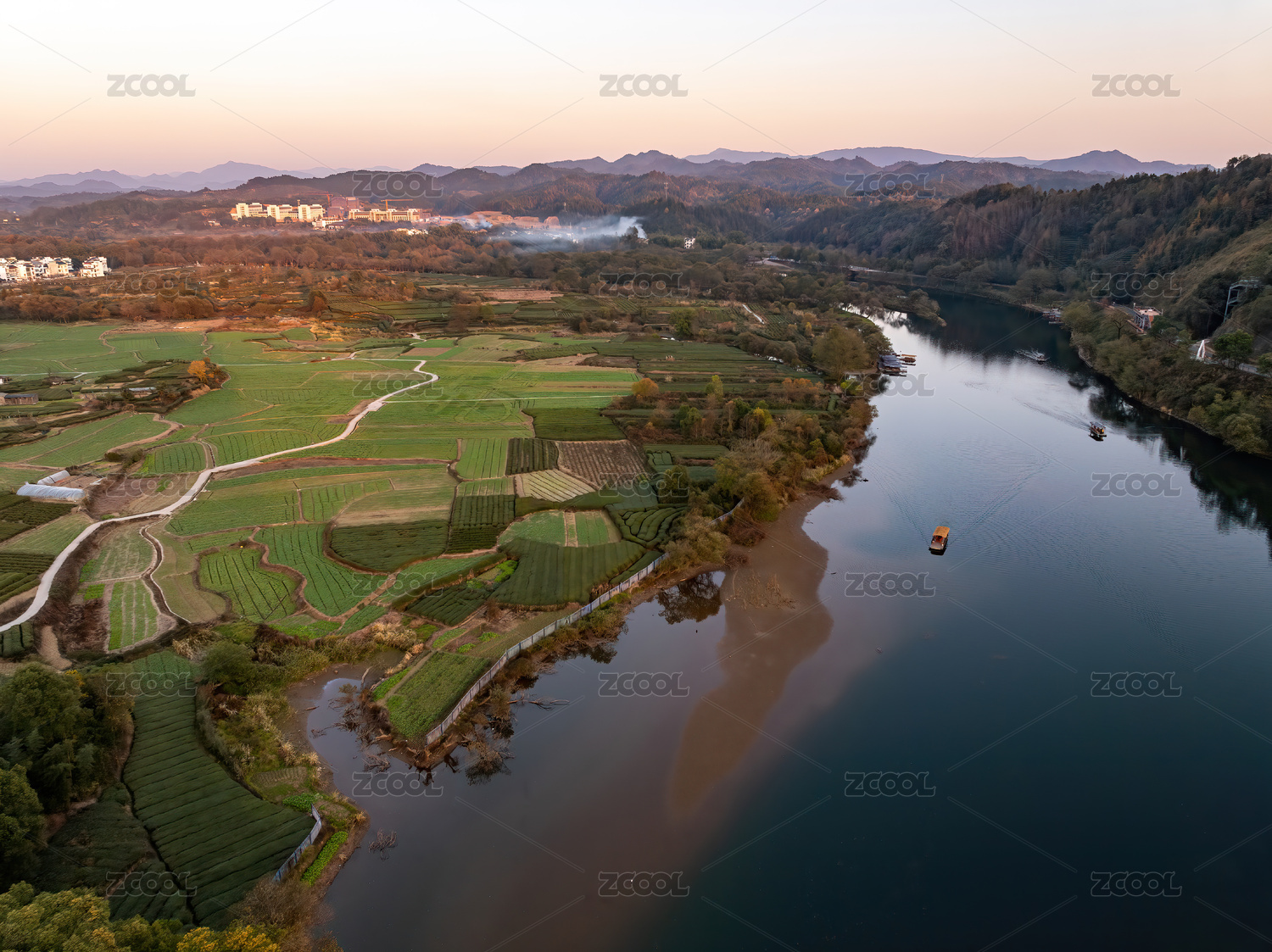 江西上饶婺源月亮湾游船日落晨雾航拍