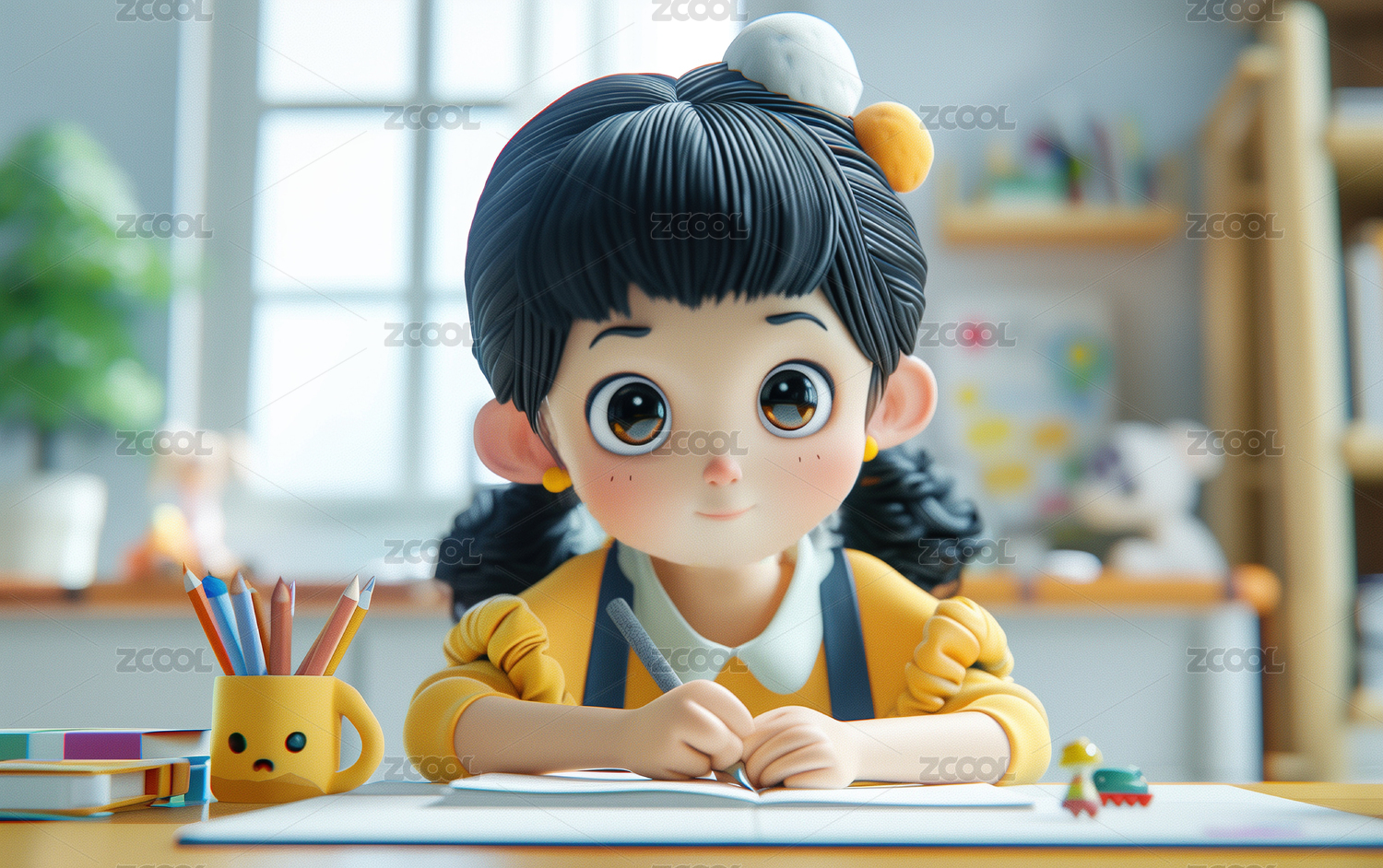 室内窗旁书桌前看书的女性3D卡通立体插画