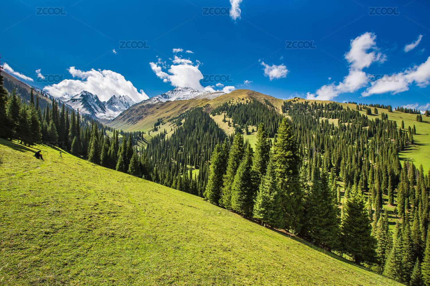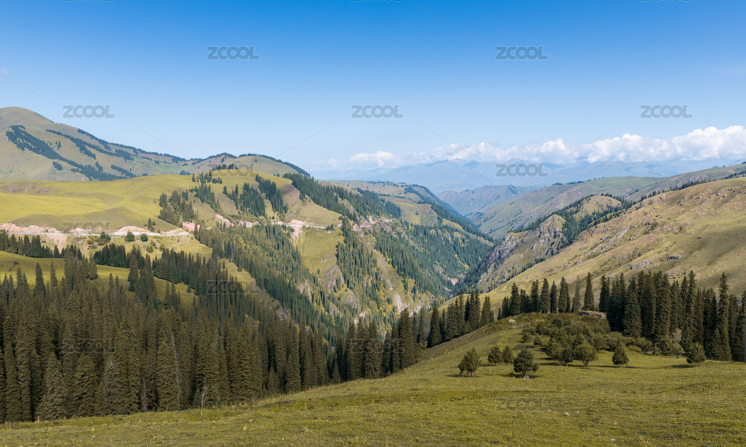 中国,新疆,天山,草原,空中,树林,蓝天,白昼,无人,无云