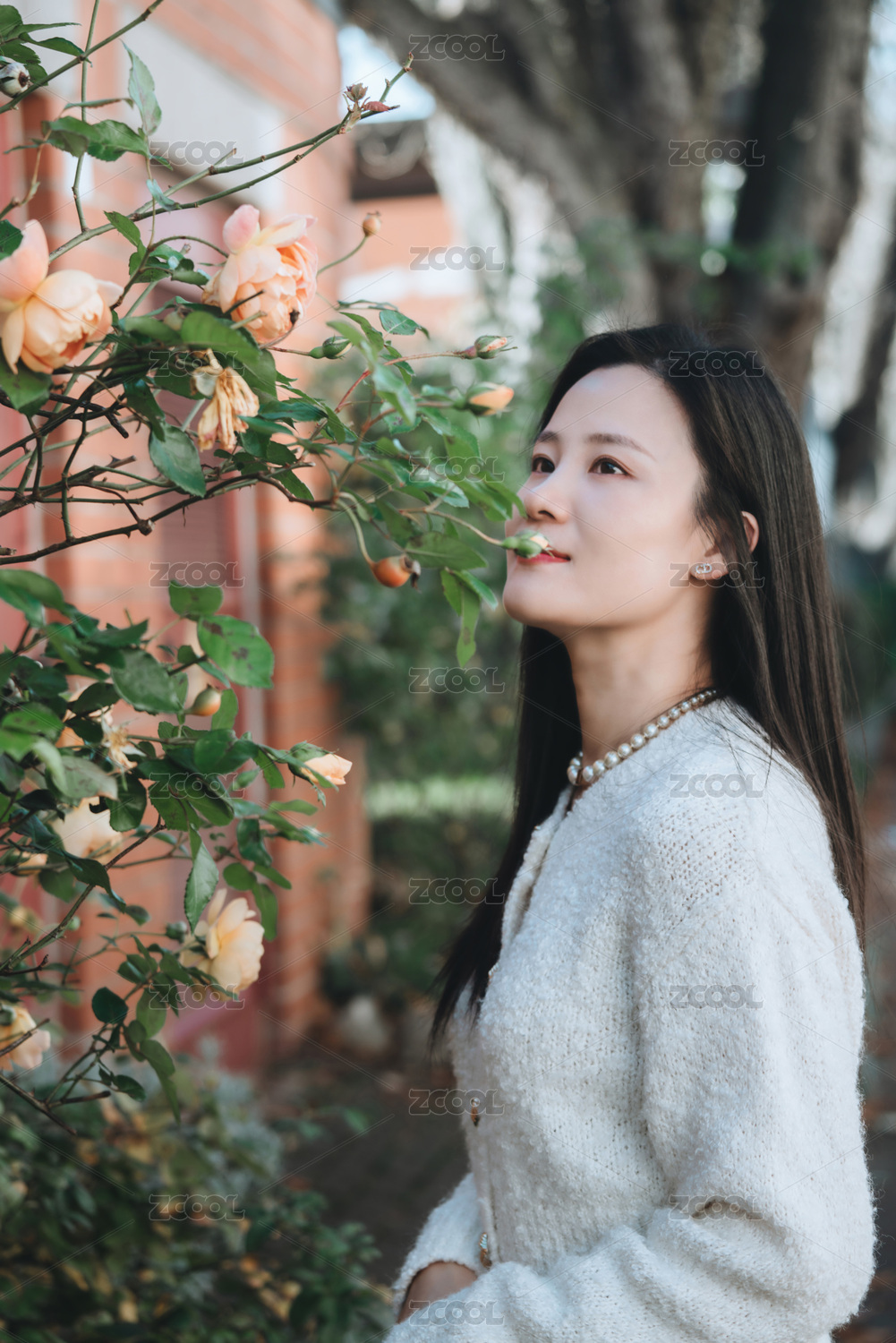秋天晴空下的穿着长裙的中国女孩在北京胡同看蔷薇花