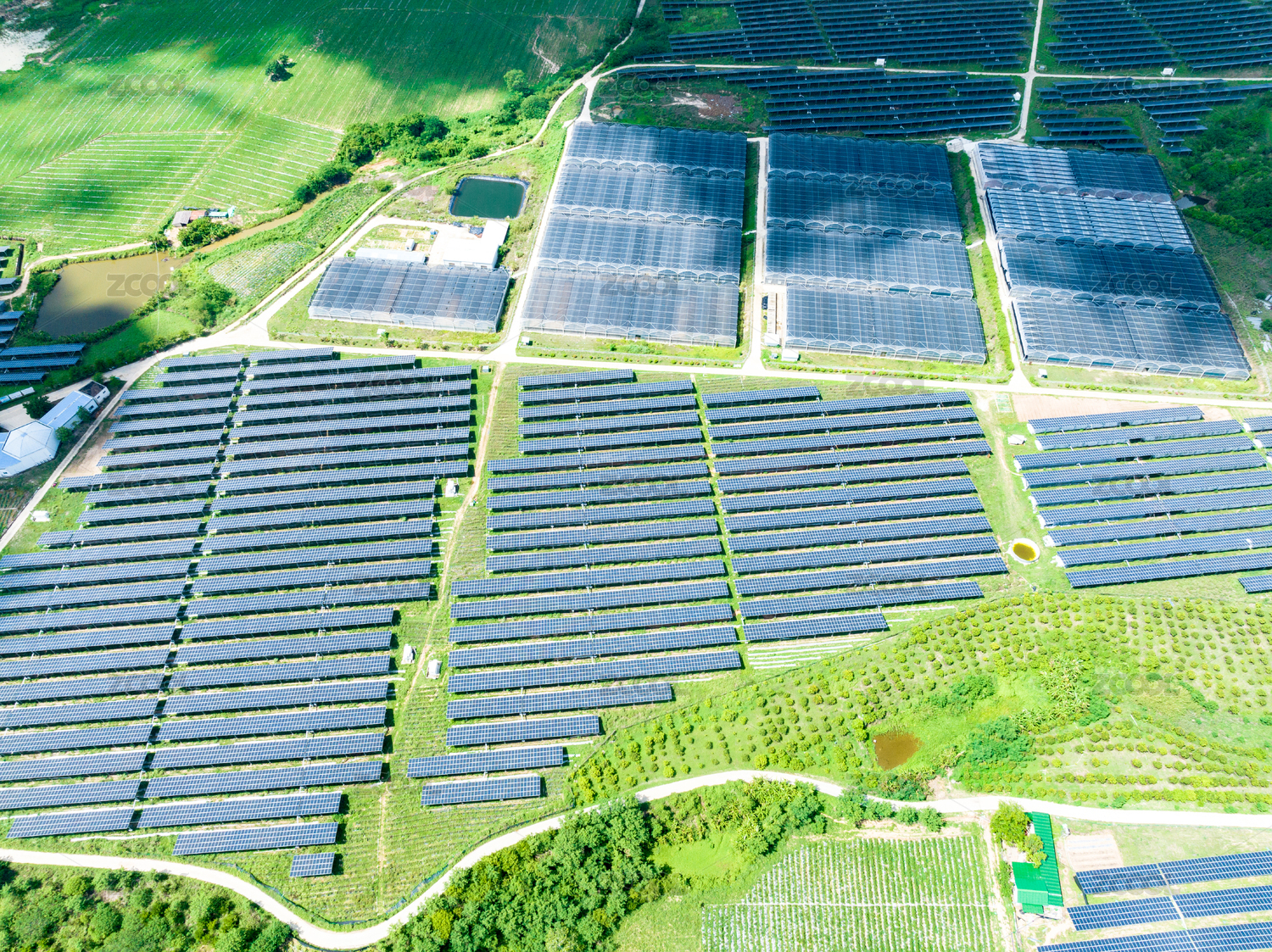 航拍绿色的植被与太阳能光伏基地