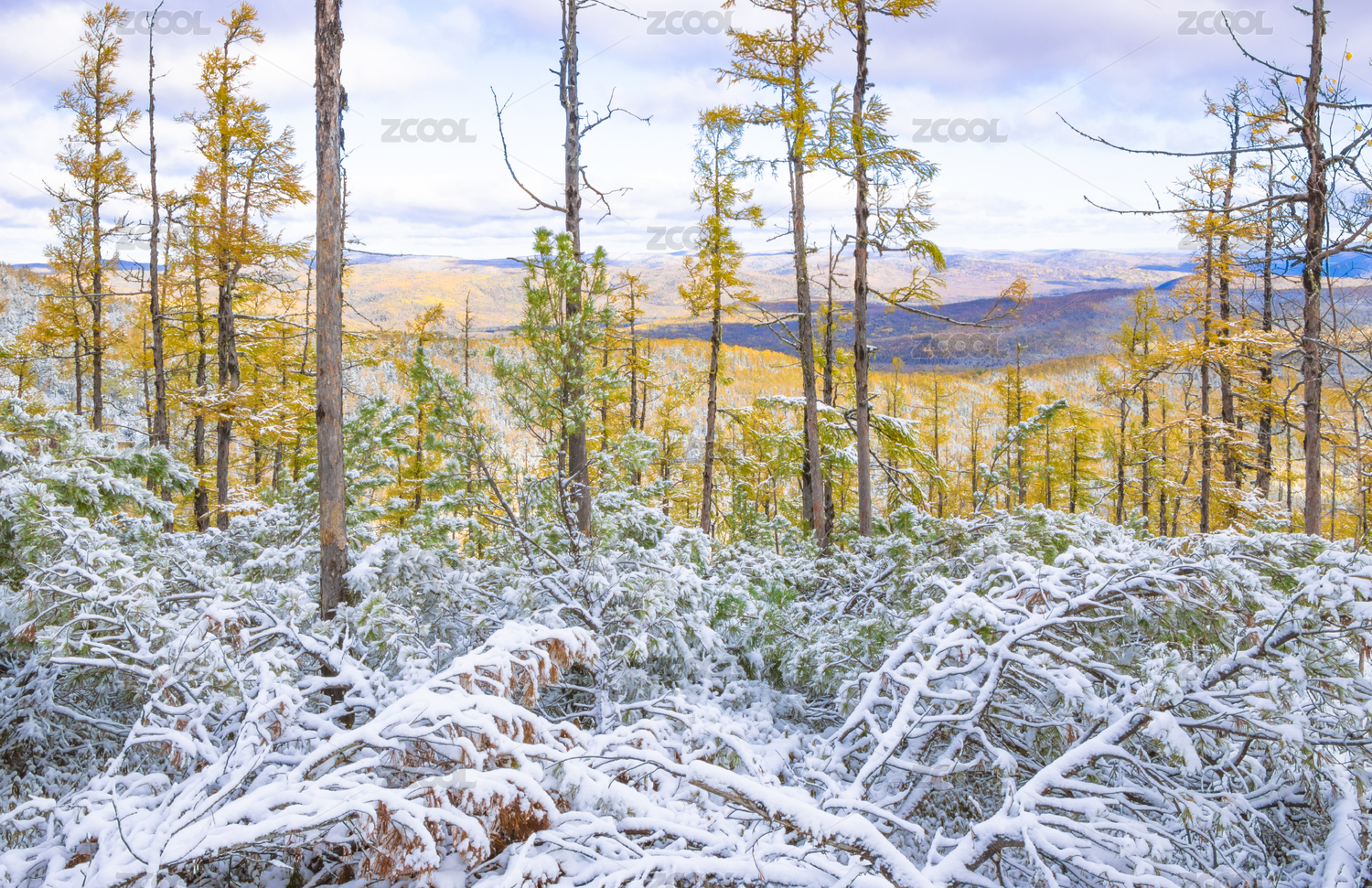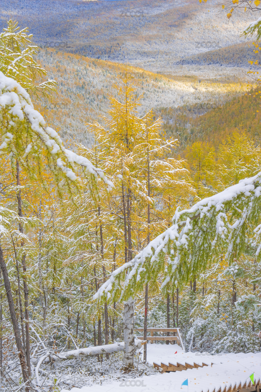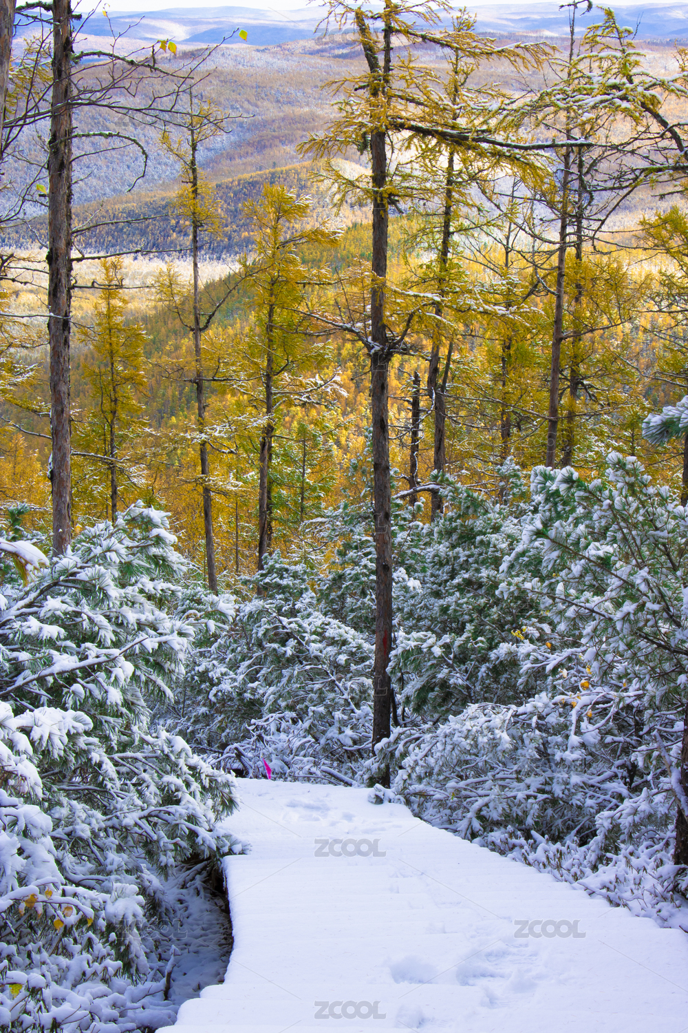 中国大兴安岭金色的落叶松与铺满雪的小路