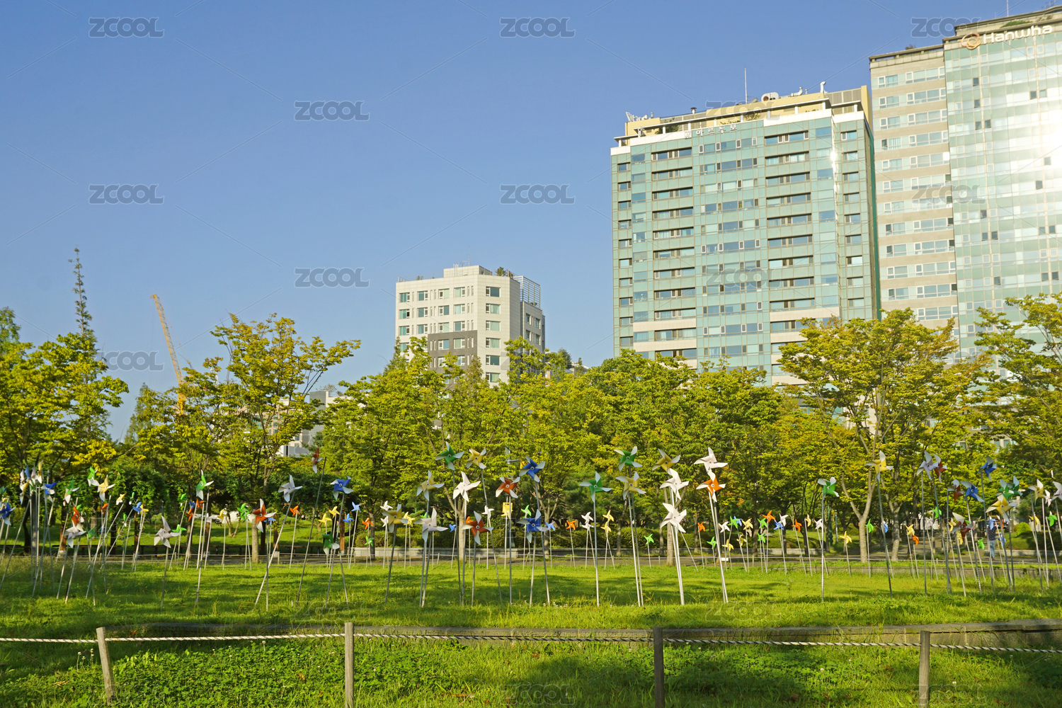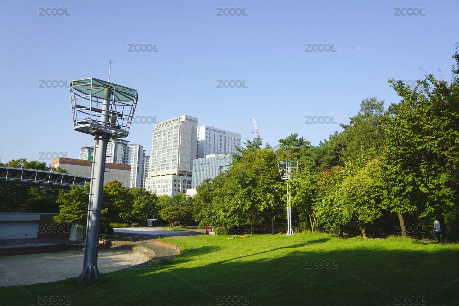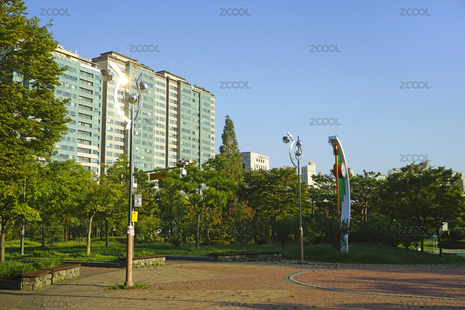 韩国水原仁溪艺术公园 早晨的树林和草地
