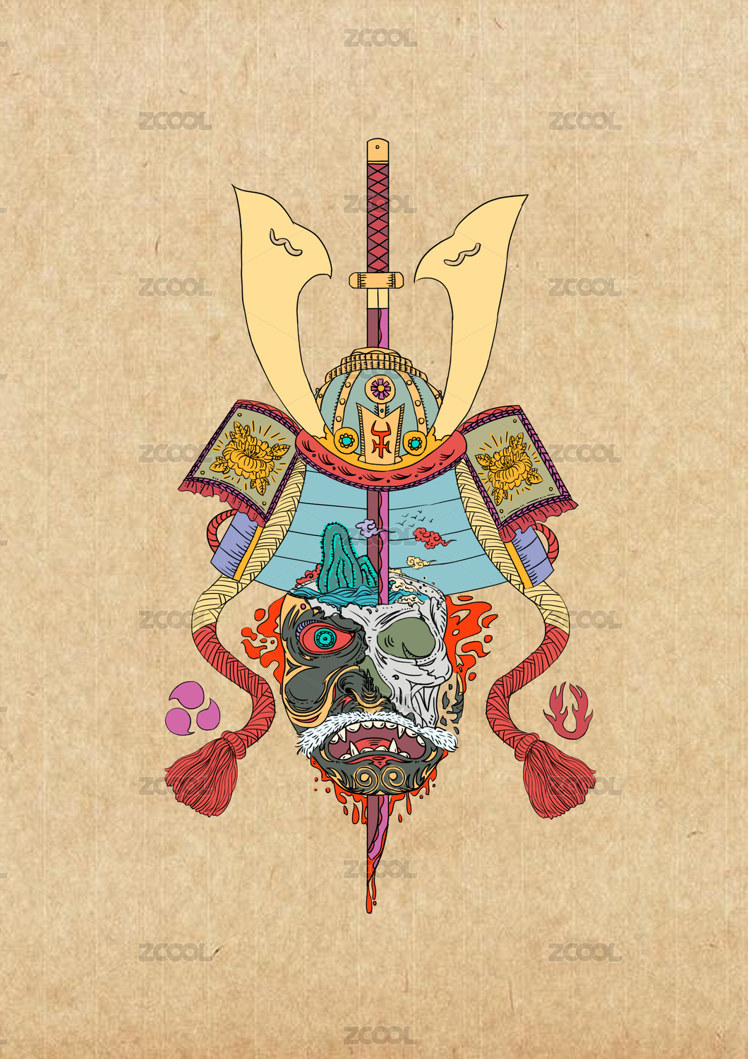 龙和橘子柿子鱼植物的插画