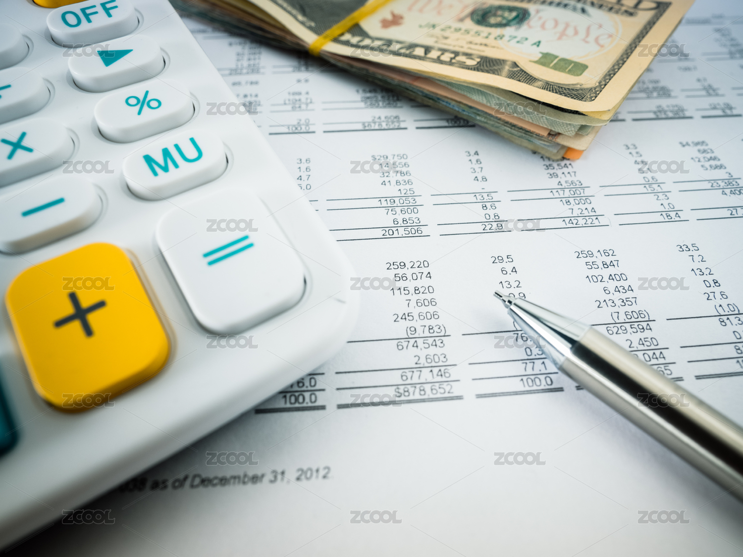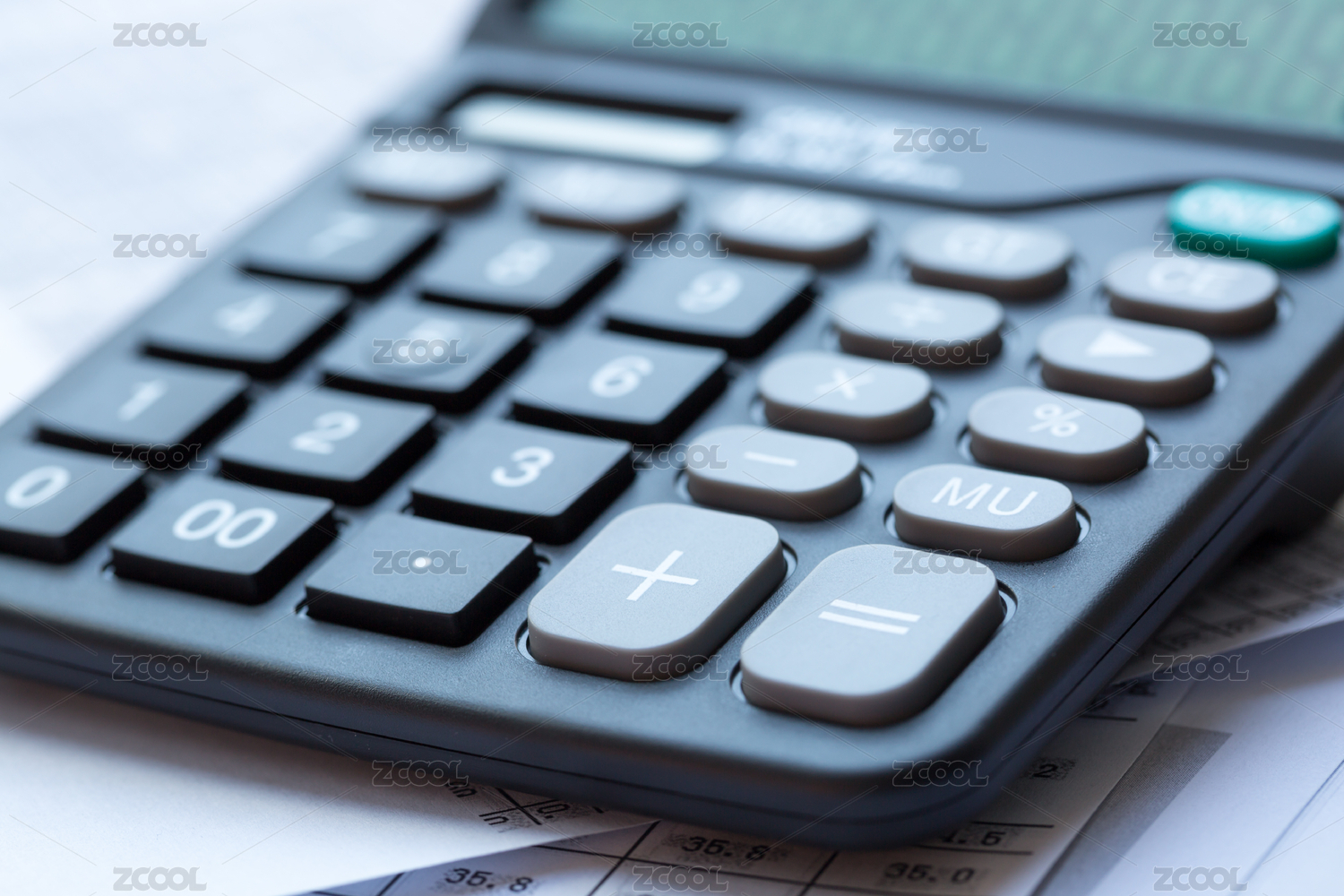 计算器的特写镜头。一种印刷资产负债表和笔也是可见的。