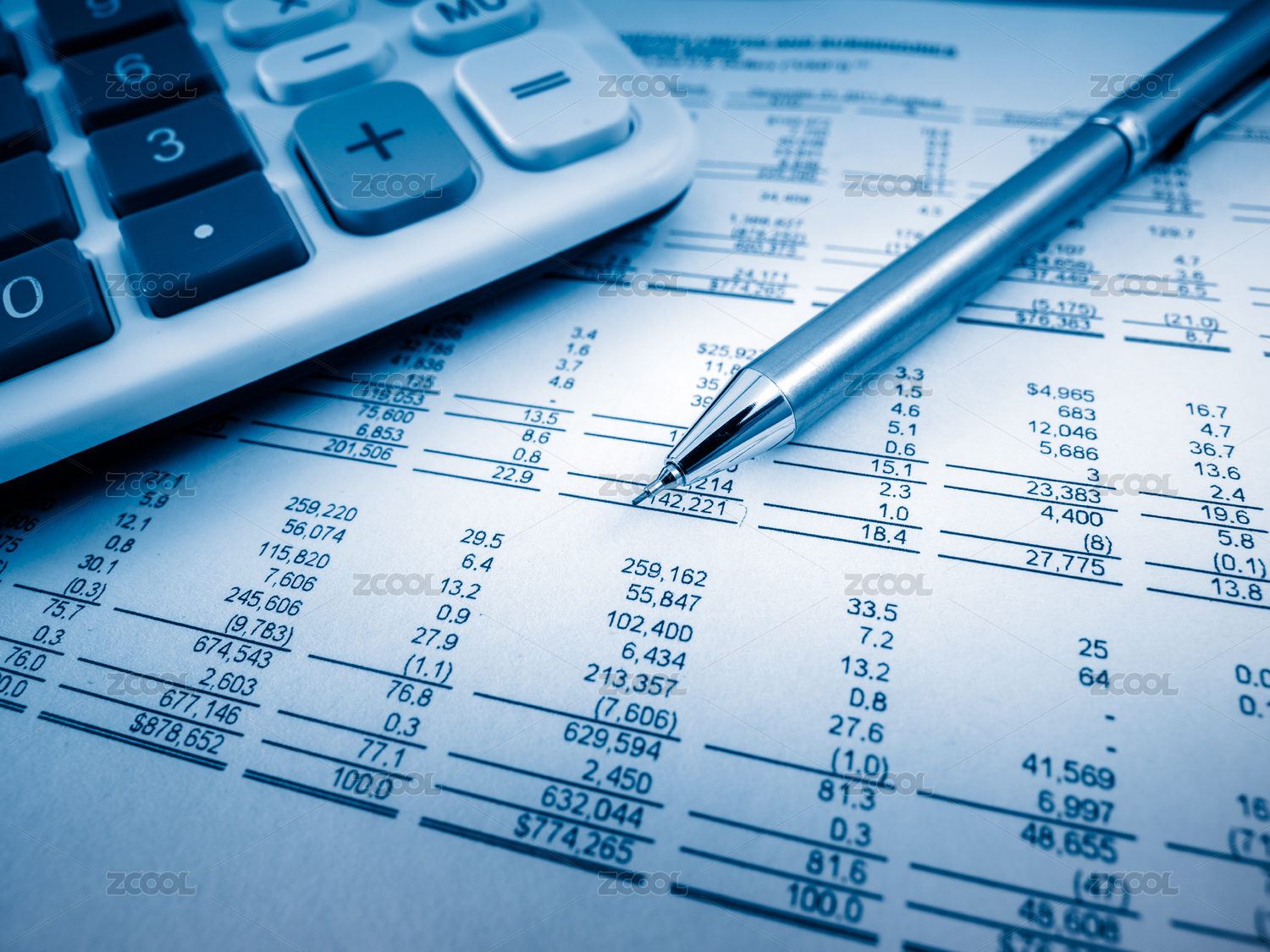 笔和计算器,以及金融数字背景的特写镜头,股市,账单等金融概念