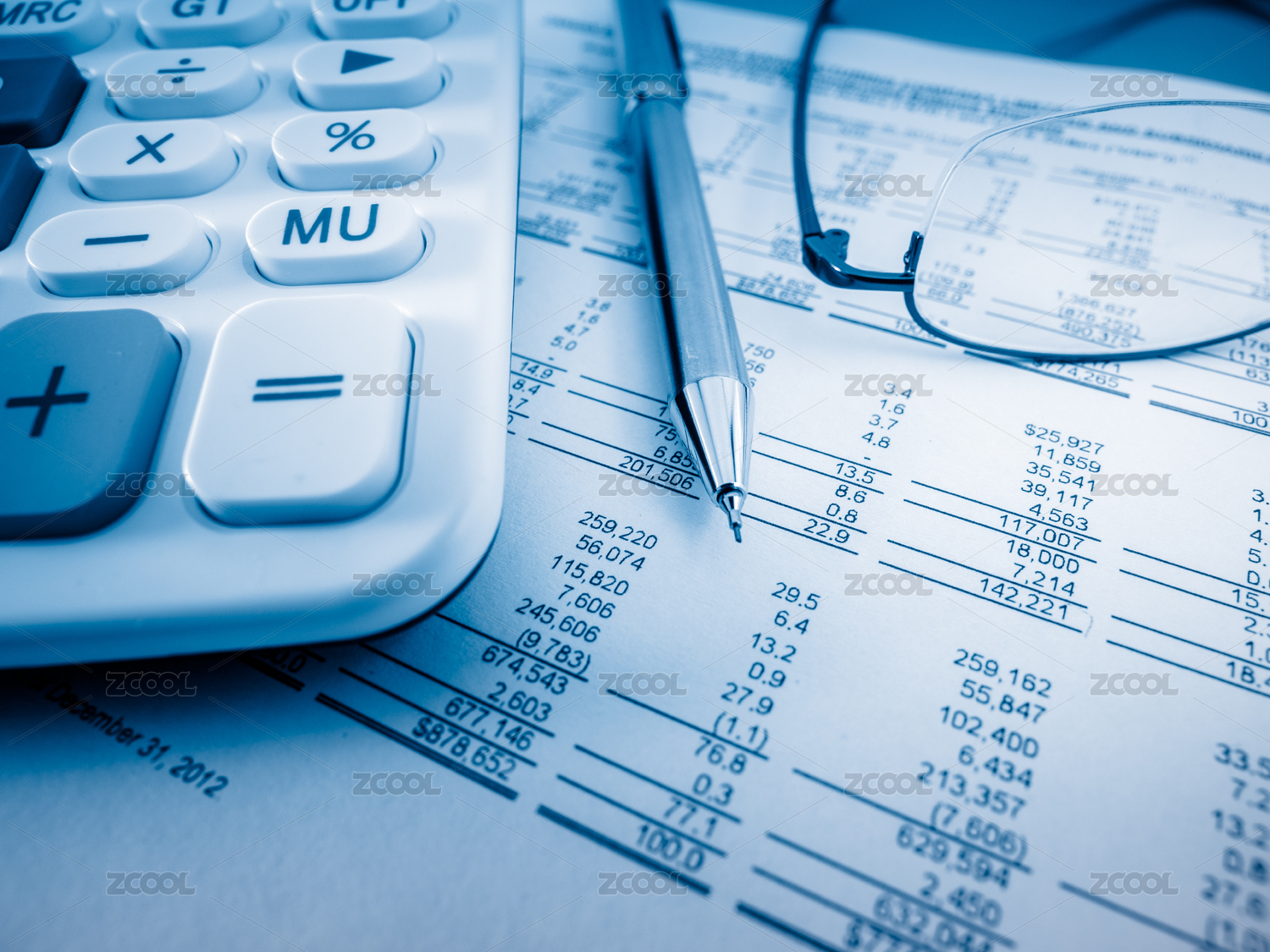 特写办公场景办公桌上放着计算器笔记本签字笔等办公用品