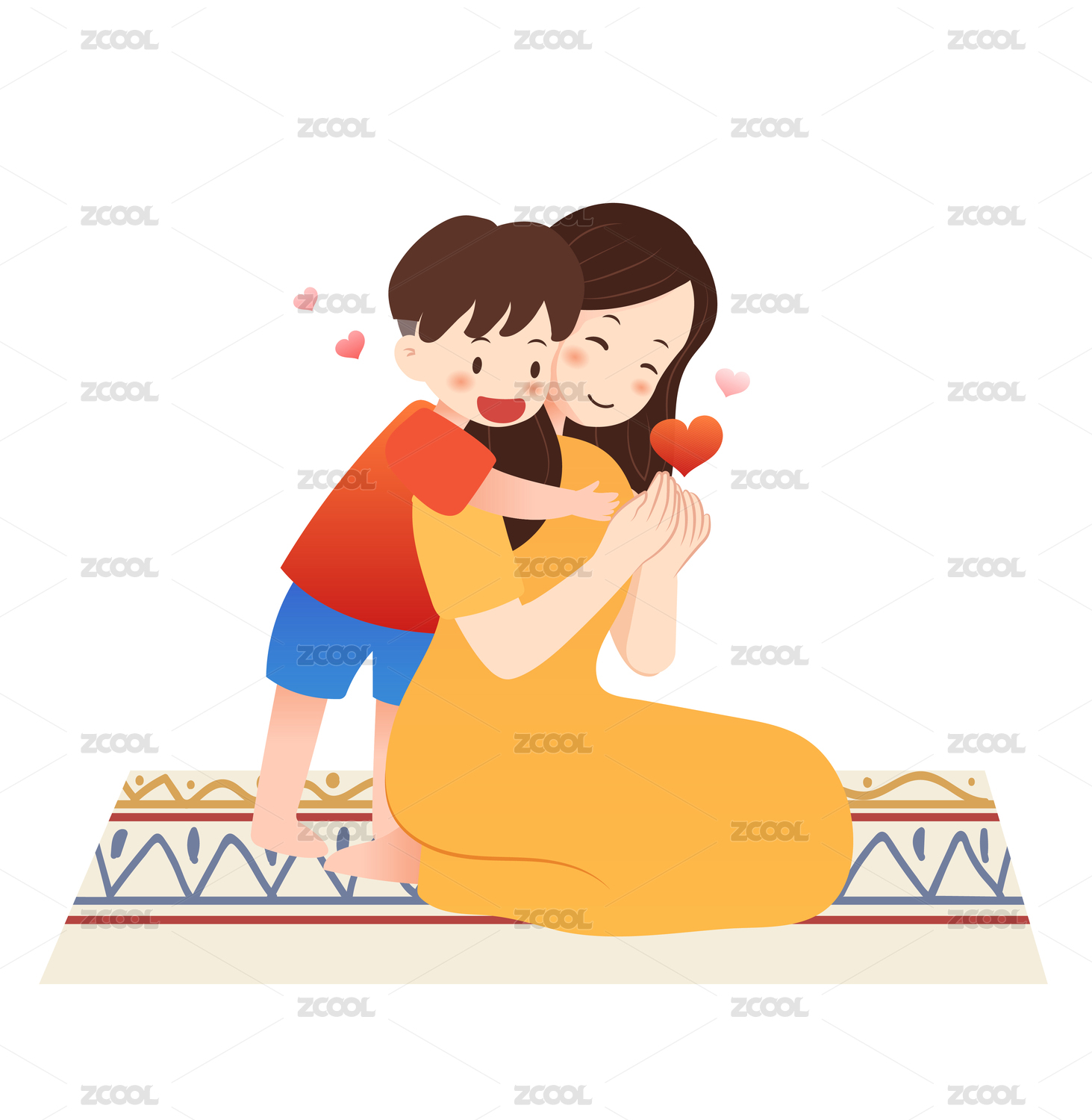 母亲节母子花丛拥抱插画感恩节家人鲜花海报