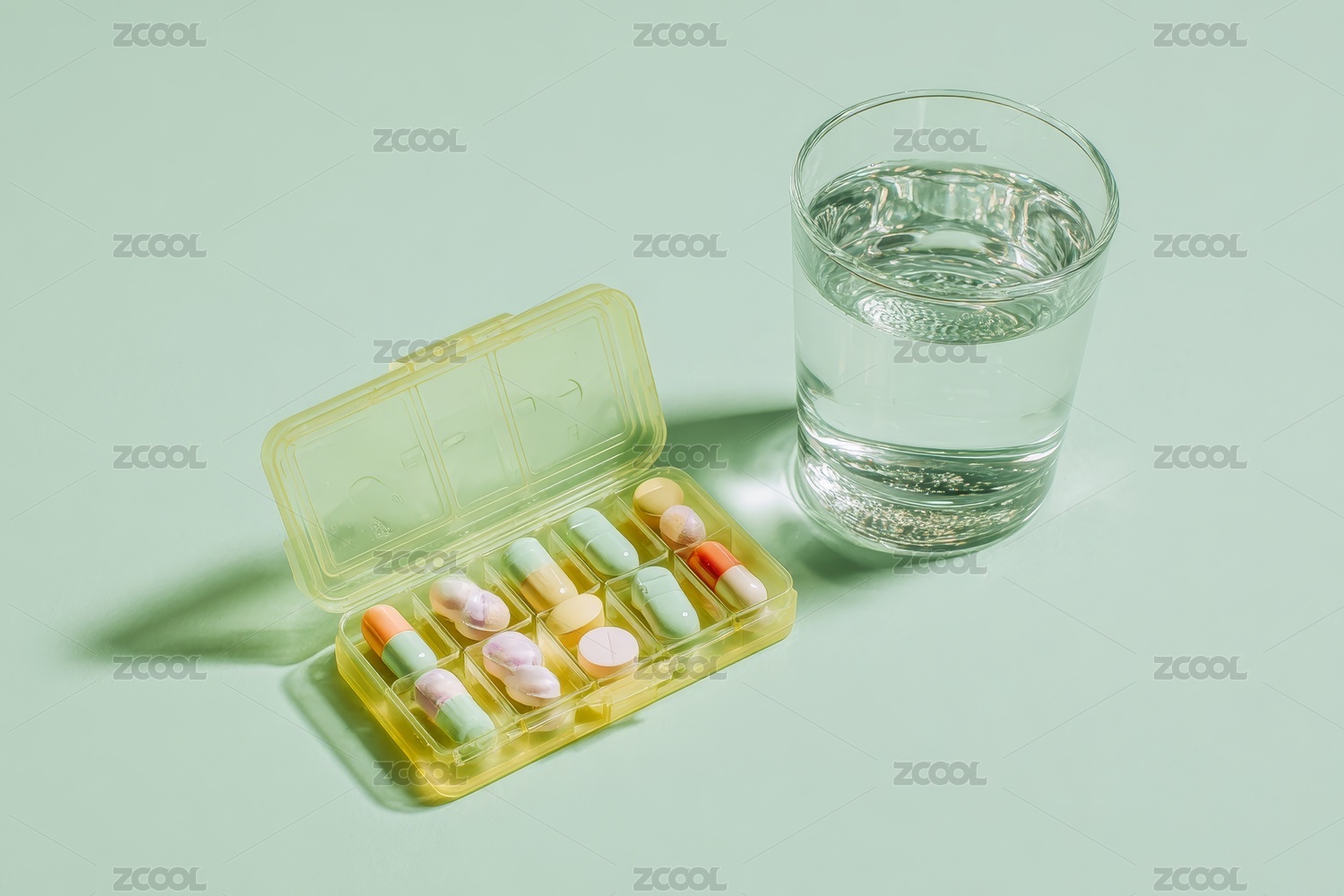 桌子上的胶囊药片和一杯清水