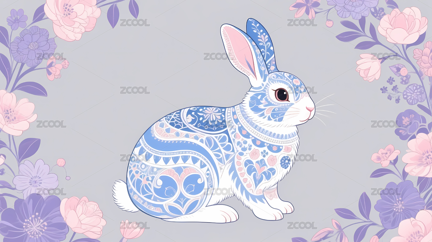 蓝色花纹兔与花朵装饰