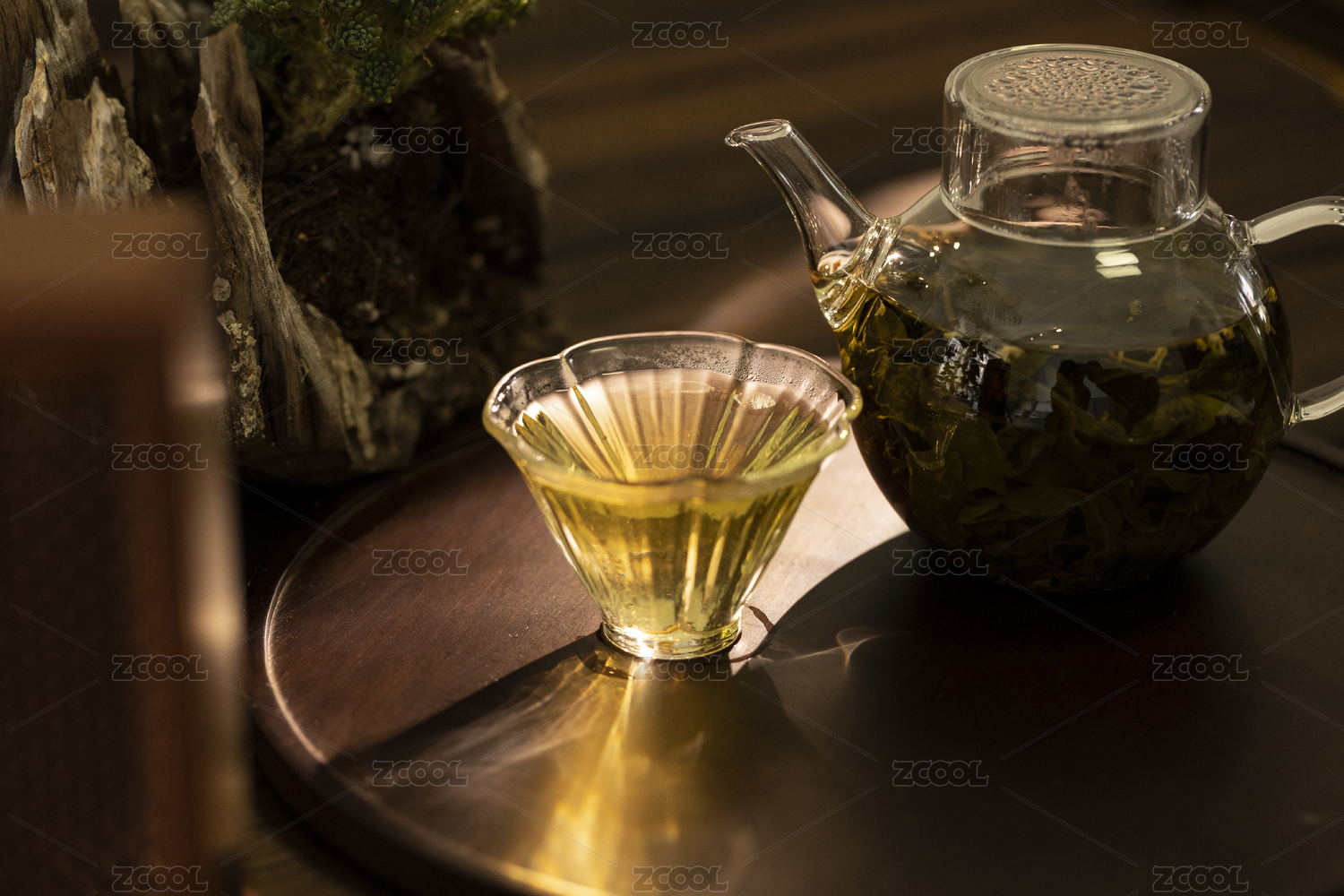 白木纹桌上的一杯中国四川蒙顶甘露绿茶