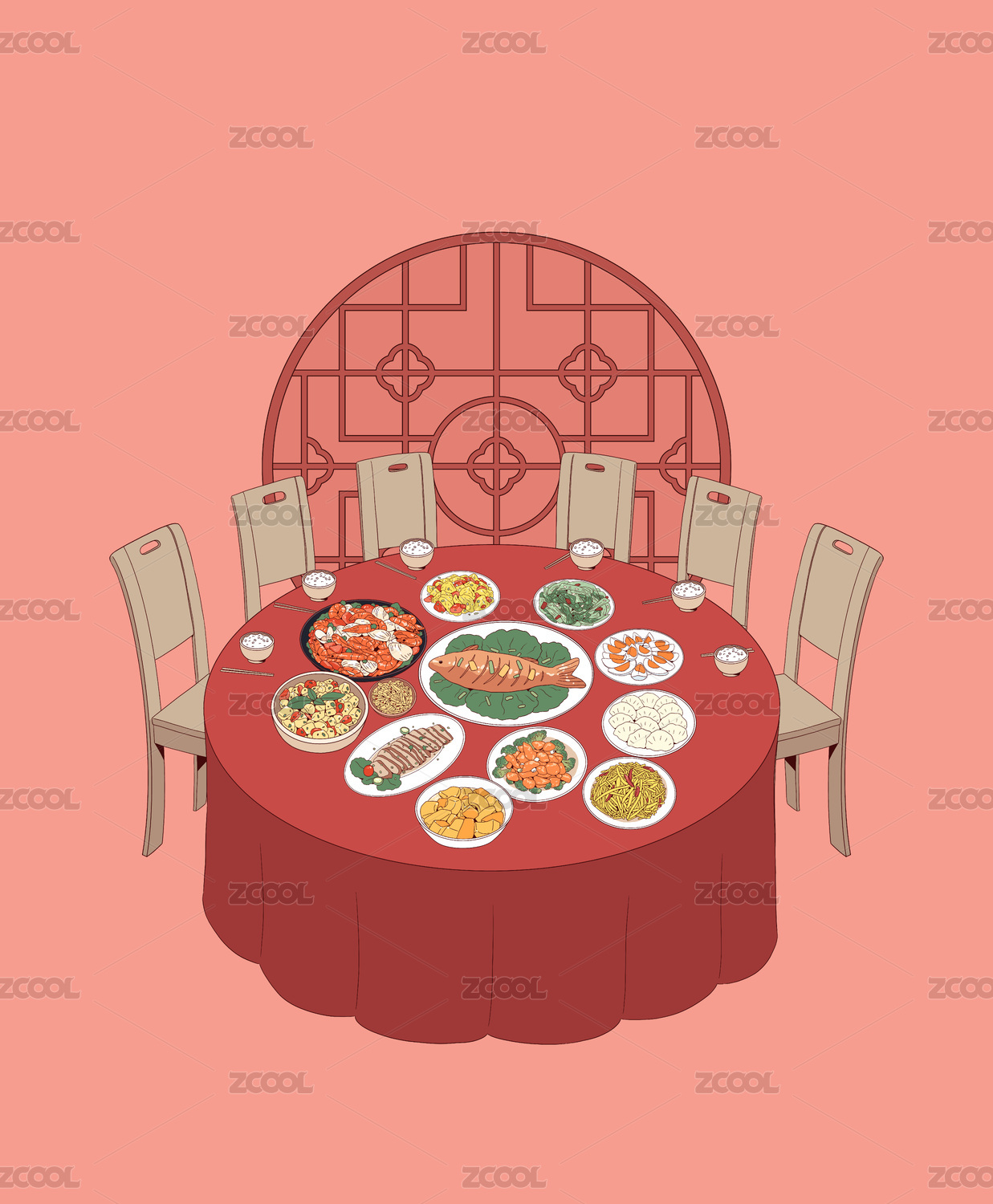 一桌丰盛的中国菜传统晚宴的中国风喜庆插画