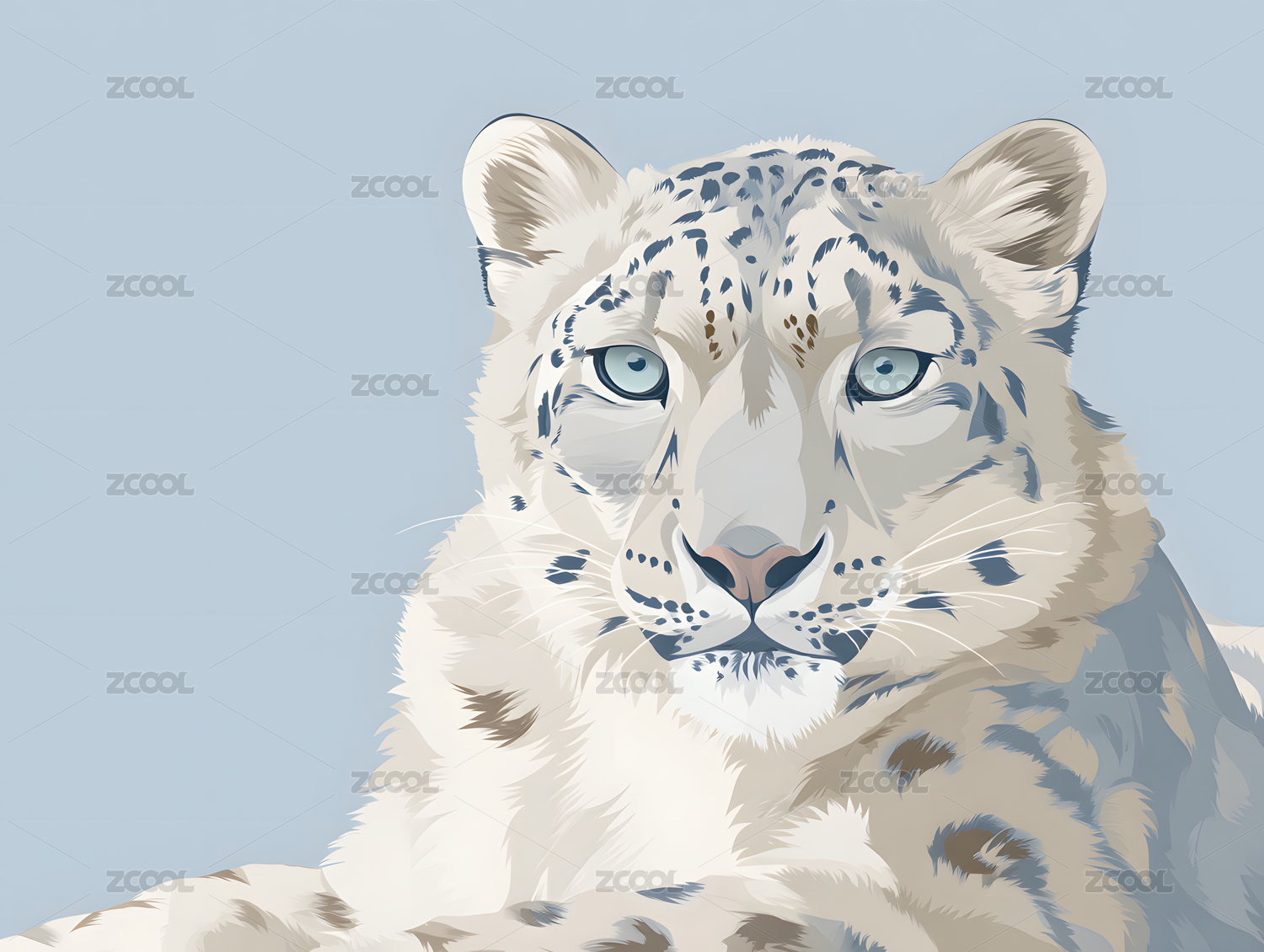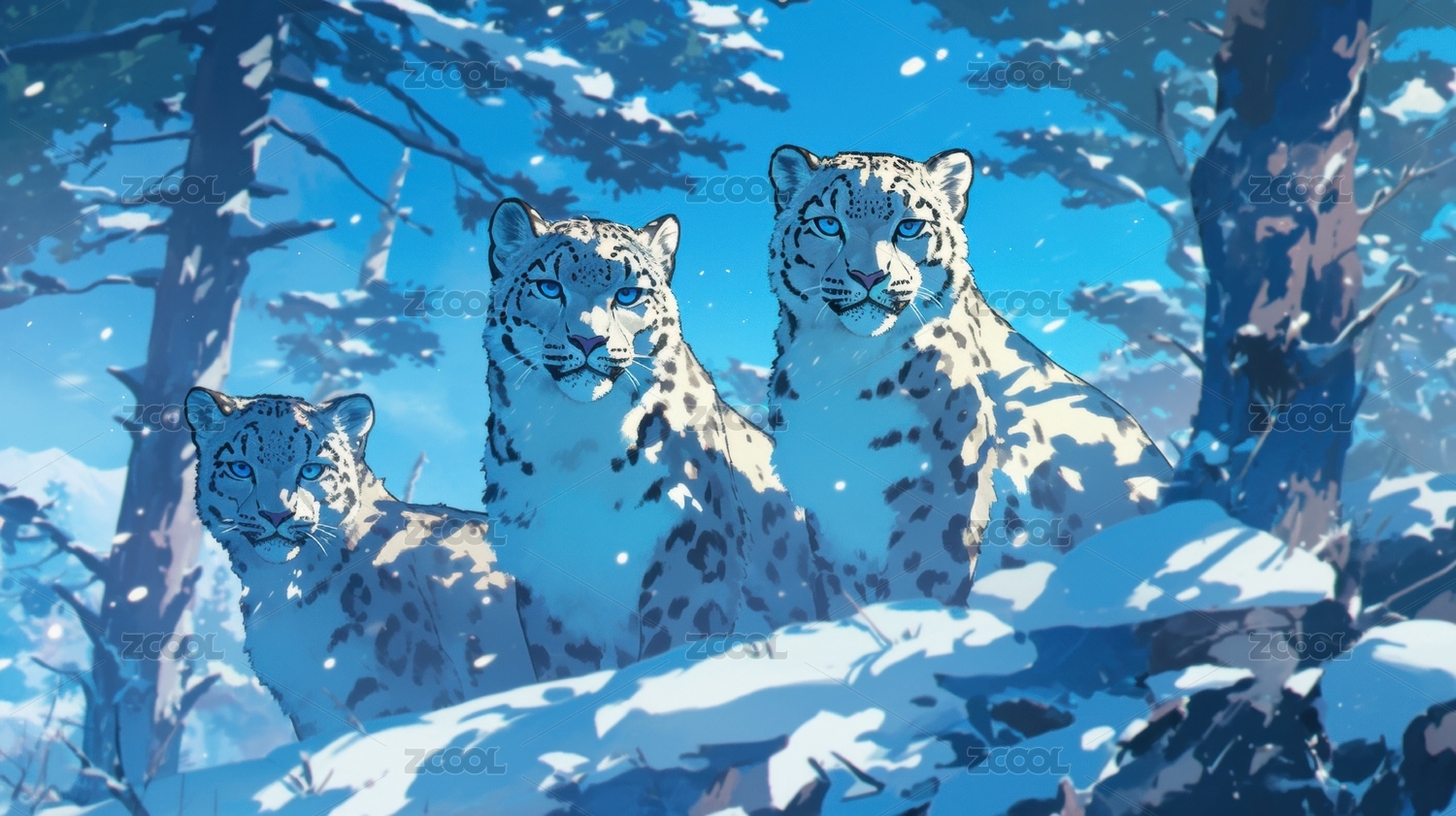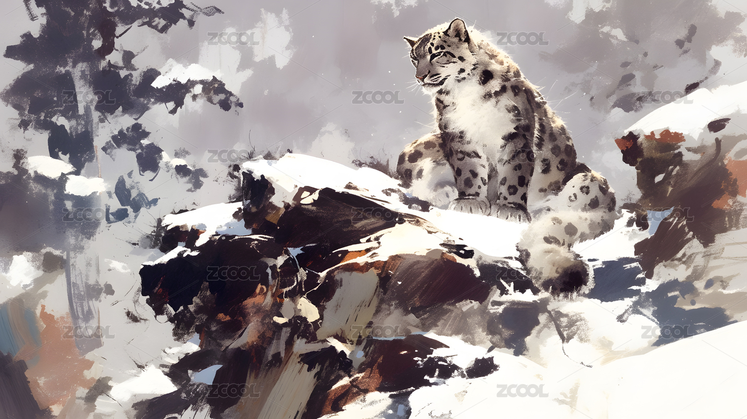 绘画,艺术,动物,水彩,雪豹,枝头,野生动物,雪景,写实,淡雅