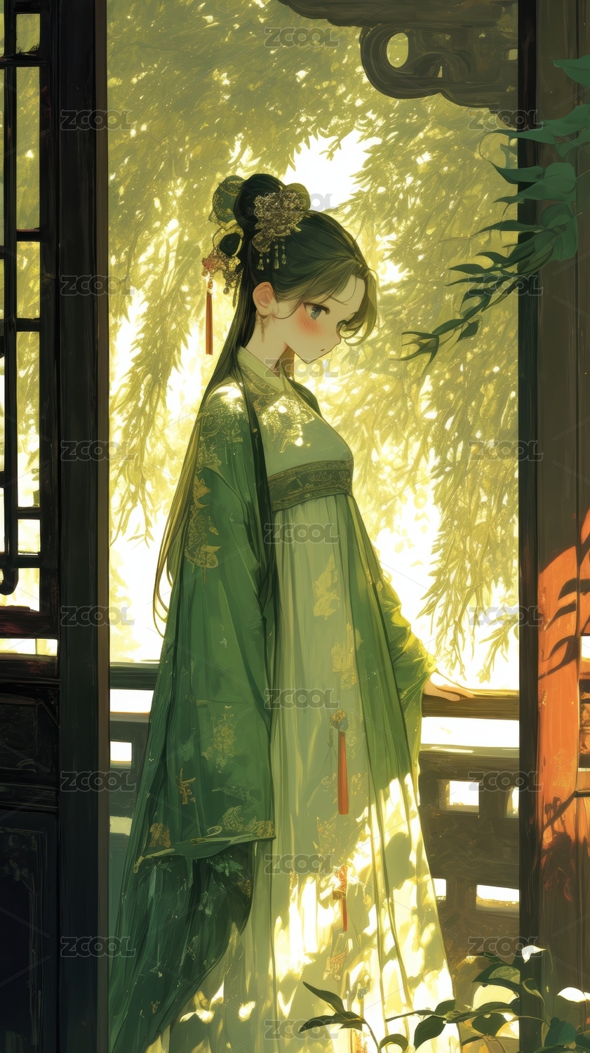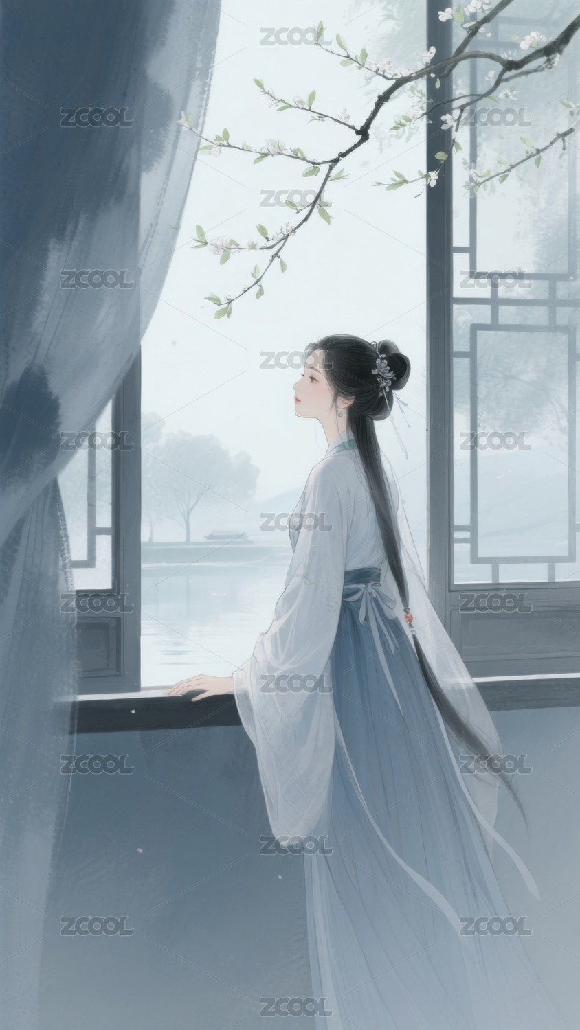 战国袍女人坐在户外门口栏杆看庭院梅花樱花
