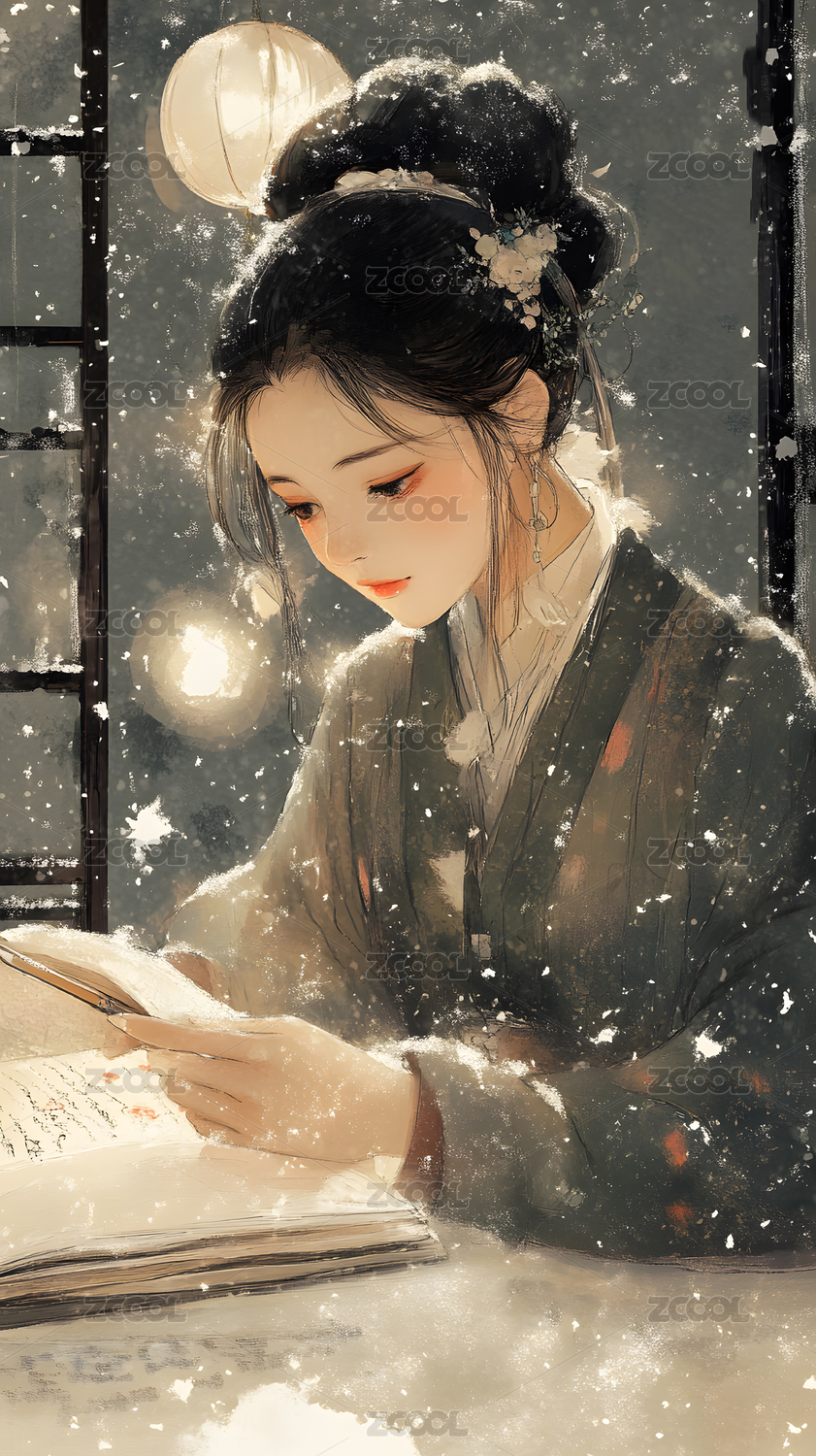 古风汉服女人坐在中式传统建筑院子里赏雪