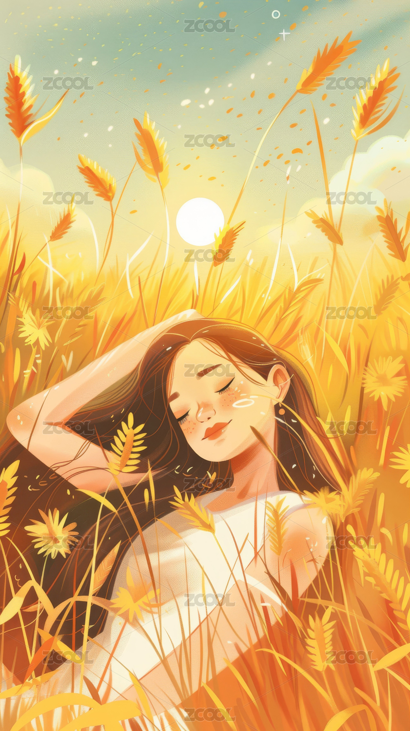 躺在金色麦田里的女孩插画背景