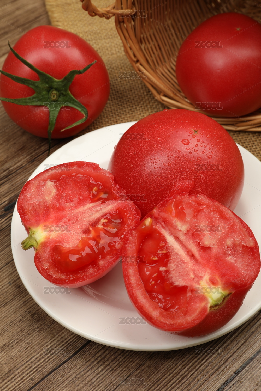 摆在木纹背景里的西红柿和西红柿切面