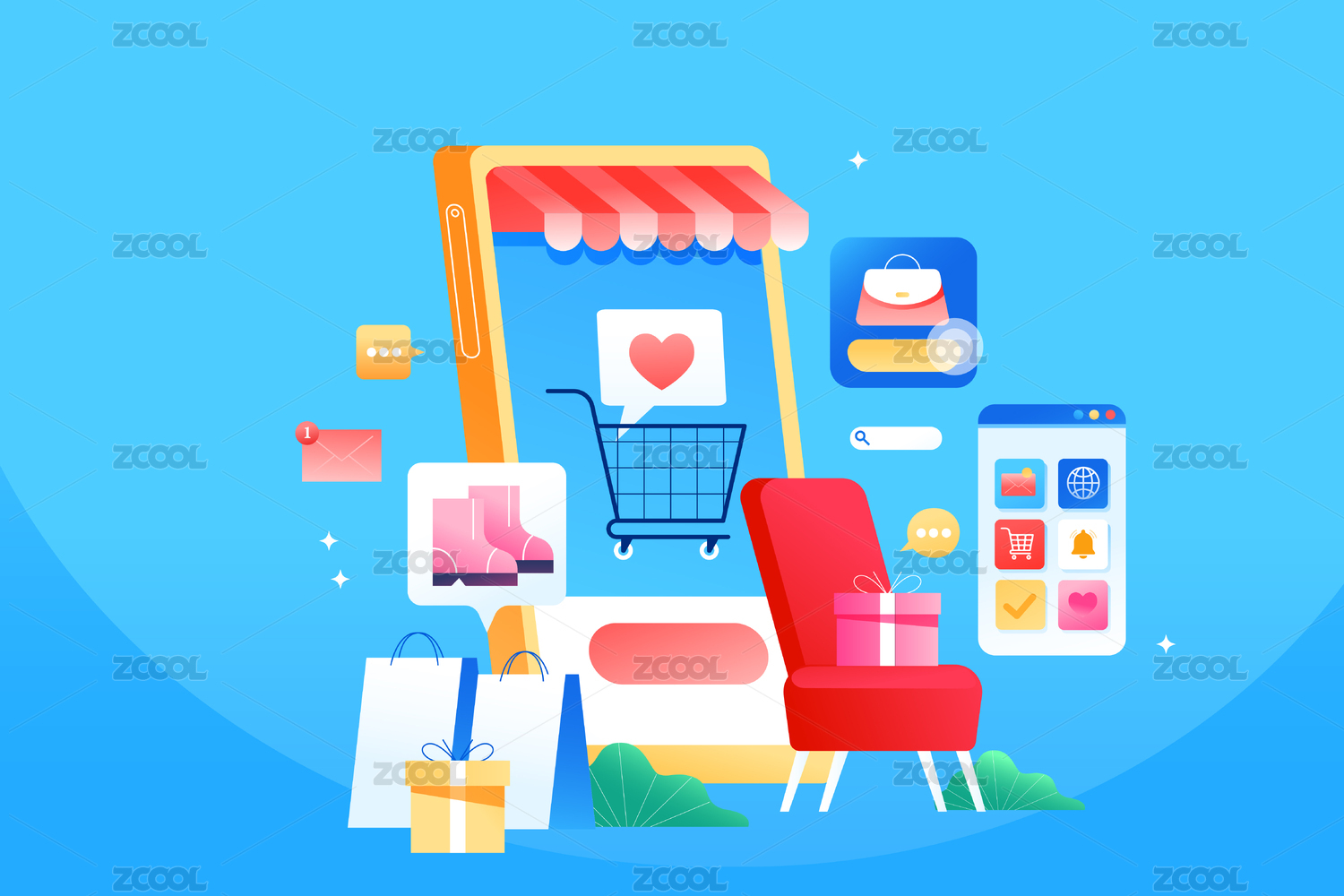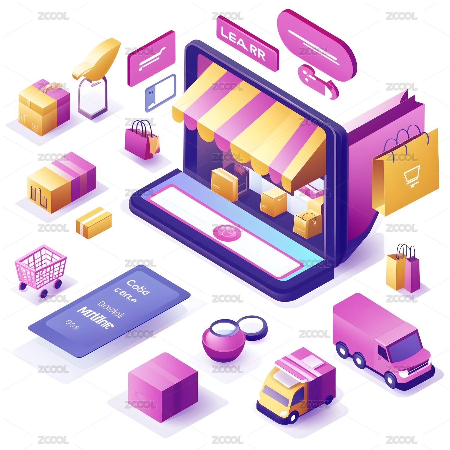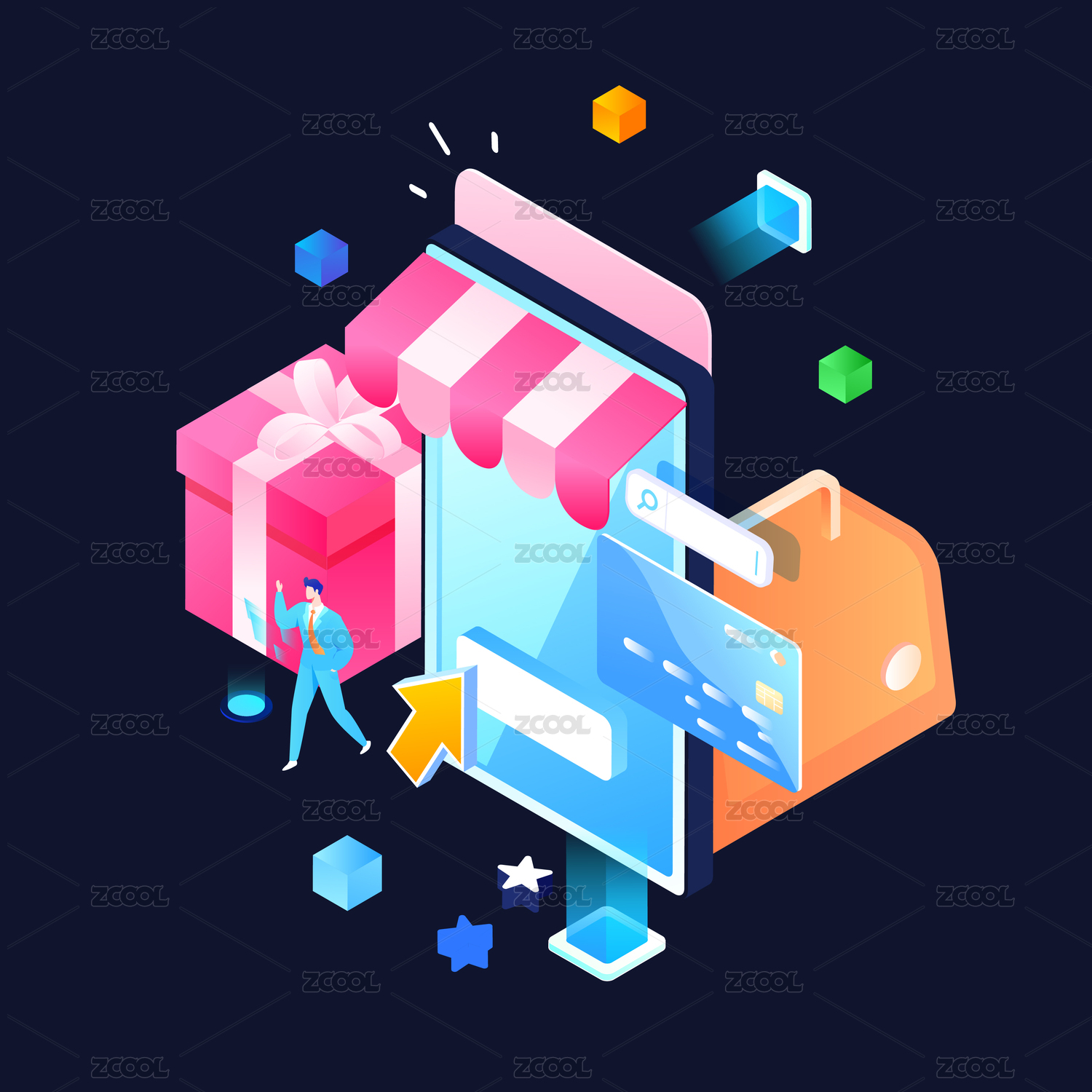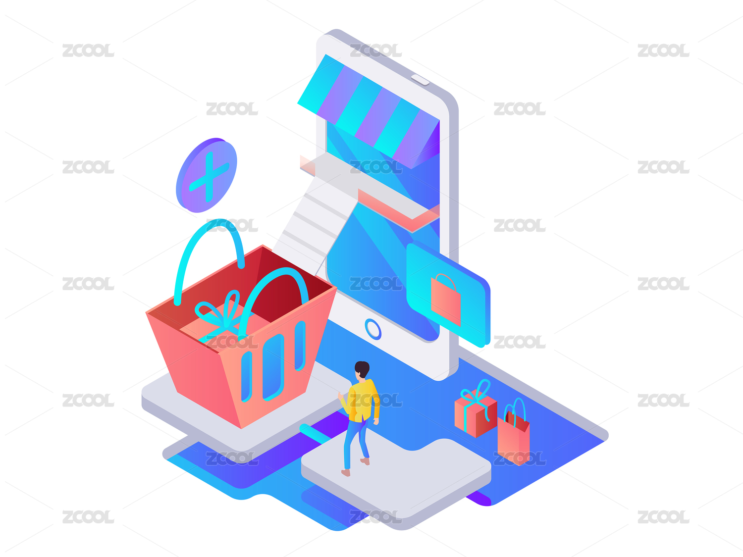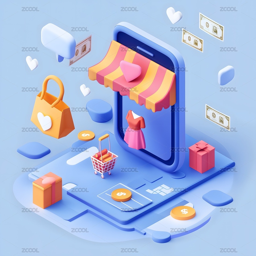 电商, 网购, 礼物, 促销, 购物袋, 3D, 粉色, 插图, 手机购物, 购物车