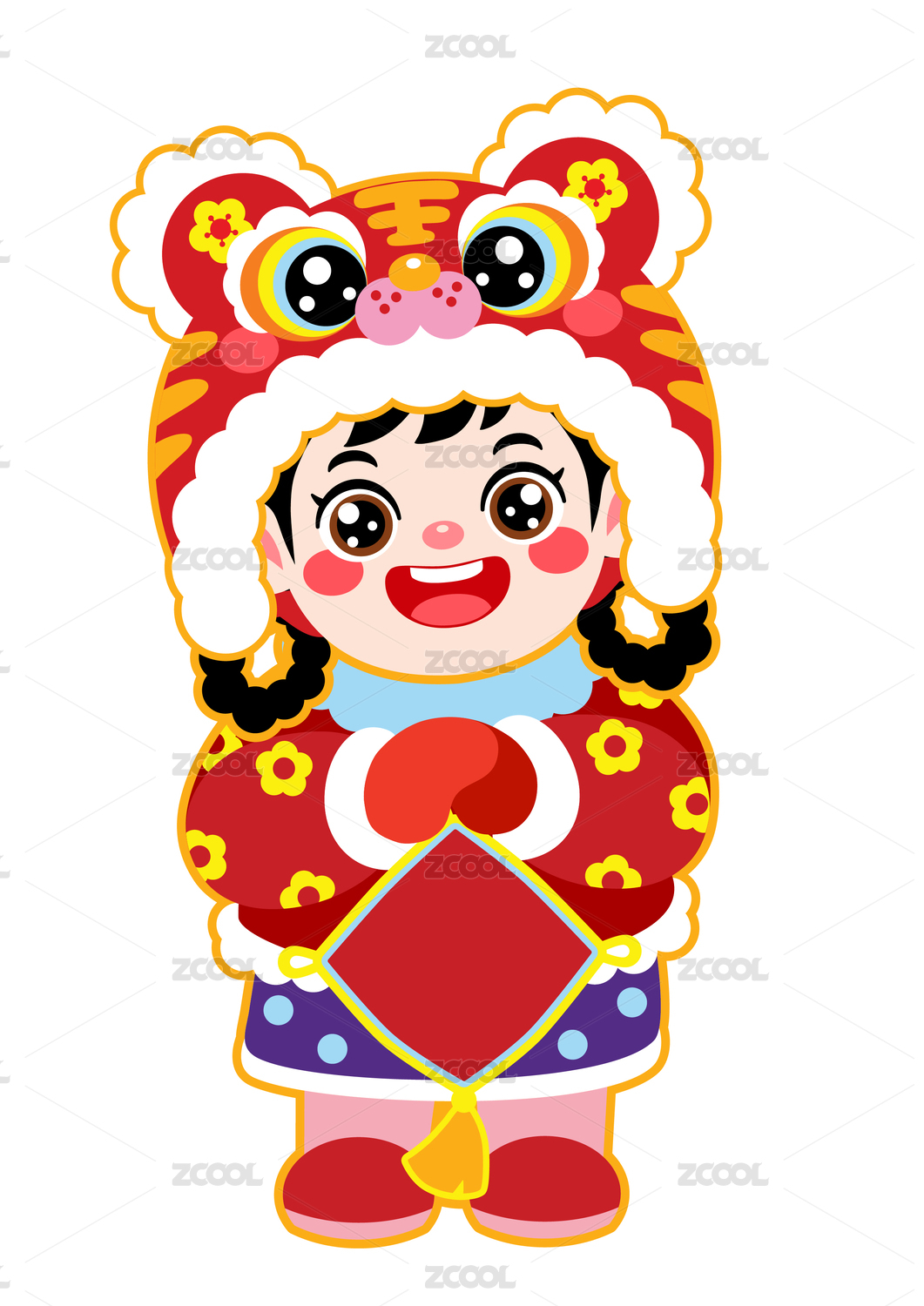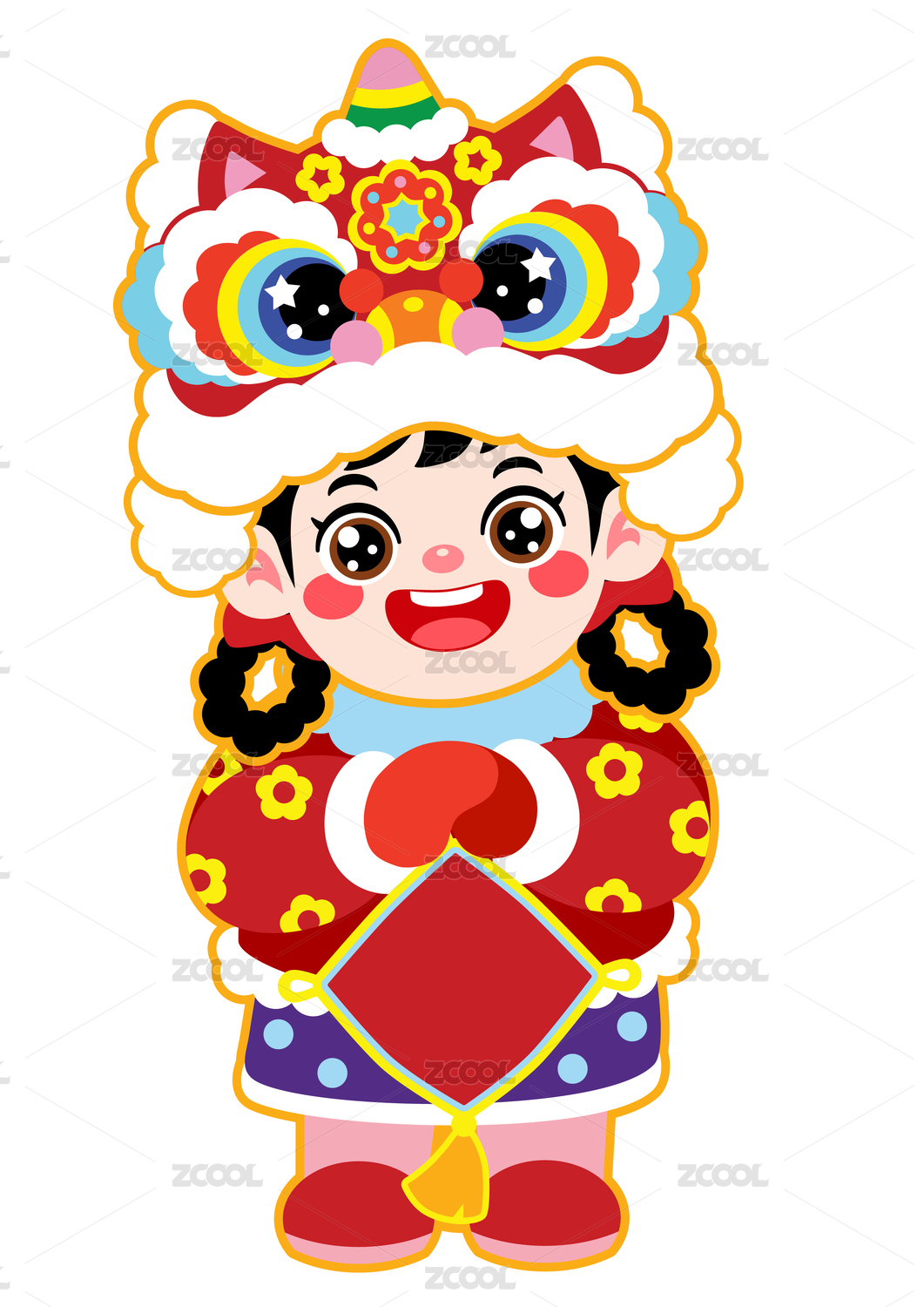 新年春节拜年醒狮帽福娃女孩矢量插画
