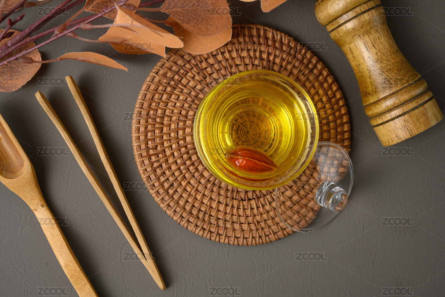 透明玻璃盖碗茶杯中的茶叶,在原木色桌面背景上