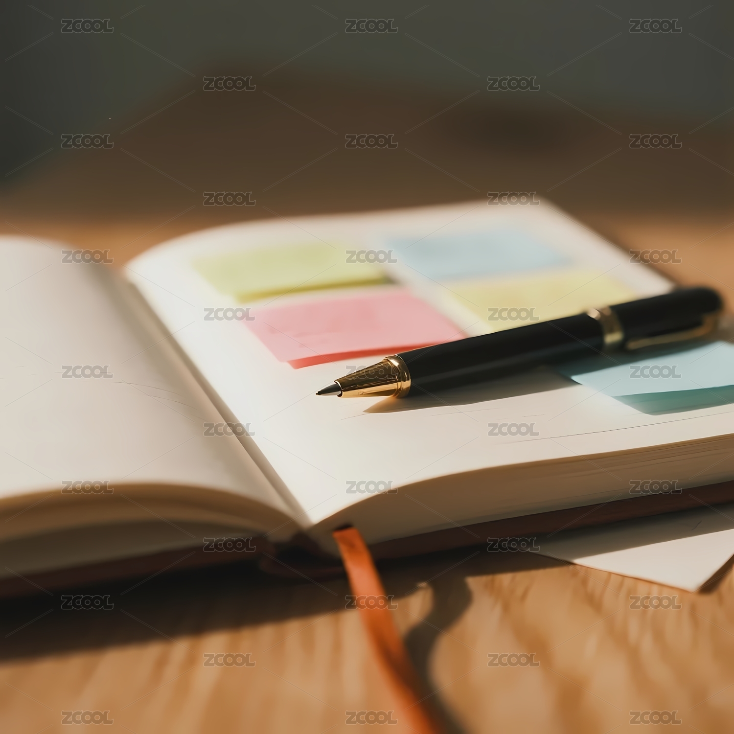 特写办公场景工作台上放着笔记本电脑签字笔笔记本文件夹等办公用品