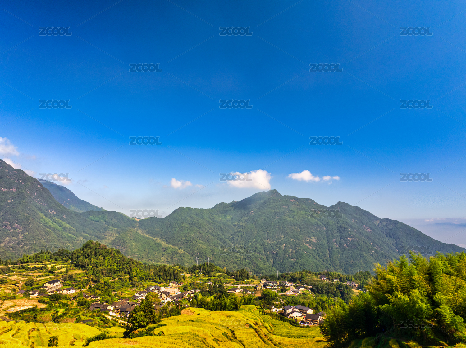 云和山村水稻梯田蓝天青山秋天风光