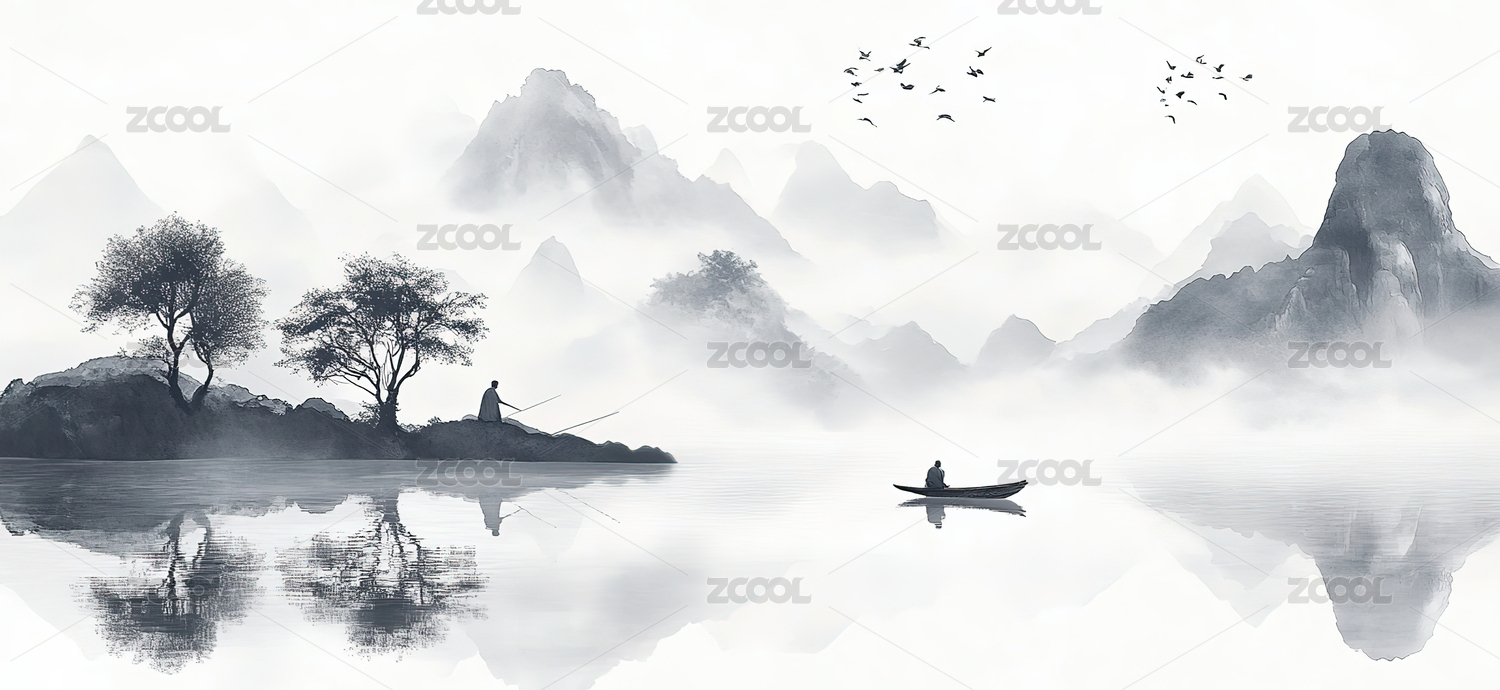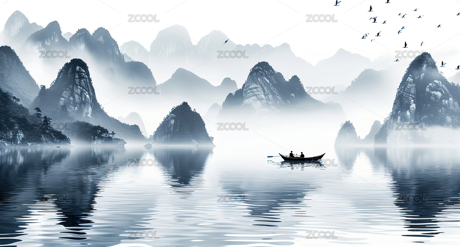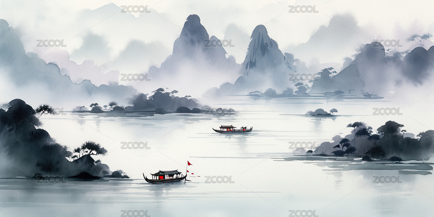 中国风,山水画,水墨风,新中式,船,舟,小船,中式山水,国画,风景